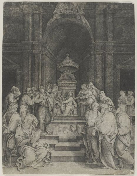 Curator: Here we have "Holy Family at a Fountain," an intriguing print attributed to Albrecht Altdorfer, created sometime between 1500 and 1538. It's currently held in the Metropolitan Museum of Art. Editor: My first thought? This image is bursting with textures. Look at the crisp detail in the hatching, the play of light and shadow. It almost feels like a stage set, dramatically lit. Curator: Indeed, the formal structure directs our focus through carefully constructed tiers, beginning with the ground level up to the arched ceiling. The contrast created is very sharp. How do you respond to the central scene? Editor: The Holy Family, gathered at this elaborate fountain, almost feels incidental amid the riot of detail. The putti scrambling about, that winged figure, all these baroque flourishes distract the eye. I wonder, is it supposed to depict this scene of holiness, or simply act as scenery? Curator: Consider the setting. The architectural forms display classical ideals that experienced a renaissance in the Italian sphere around this period, which indicates something to the work's original intended audience, even when divorced from a strictly Christian context. Editor: That's interesting! I'm caught by the faces, especially on the angelic beings. It's playful, isn't it? Maybe Altdorfer meant it to be humorous, perhaps to satirize what are traditionally considered images of sanctity. Curator: Satire is an appealing idea. While elements such as visual layering draw attention away from core themes, figuration is used extensively as the artistic emphasis across many other renaissance-era paintings. Here, there is significant divergence from these standards. Editor: It makes me think, perhaps it invites us to find divinity in unexpected places. Altdorfer draws it into the nooks and crannies of everyday experience and secularized beauty, as opposed to simply isolating divinity within traditional symbolic imagery. Curator: An enriching insight. A testament to how art transcends boundaries, inviting contemplation on its construction, technique and overall effect on our perceptions of sacred concepts. Editor: Exactly. It leaves you thinking, doesn't it? Now *that’s* the mark of great art.