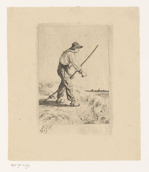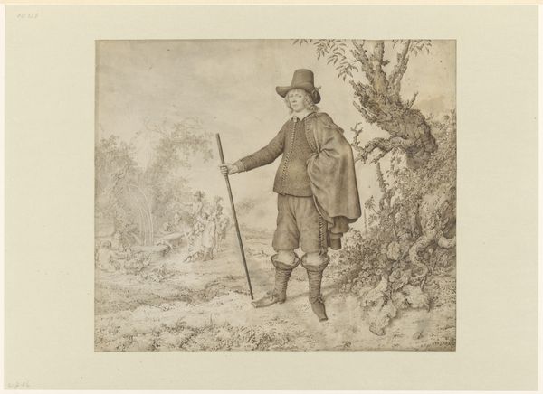 Editor: This drawing, “Arme man met wandelstok op de rug gezien” or "Poor man seen from the back with a walking stick," is by David Welle, created sometime between 1809 and 1848. It's a pencil drawing currently held at the Rijksmuseum. There's something very poignant about this lone figure; he looks so weathered and weary. What story do you think Welle is trying to tell us? Curator: The loneliness you feel emanating from this drawing is profound, isn't it? I think Welle captured the very soul of isolation and the harsh realities of life in that era. Notice the worn clothes, the simple walking stick...it whispers of hardship. But look closer—do you see the romanticism inherent in the landscape itself? Even in depicting poverty, there’s an undeniable appreciation for the natural world, an embrace of its quiet solitude. Almost like nature is the only comfort this man has. Editor: That’s interesting. So, the setting isn't just a backdrop; it’s integral to understanding the man’s situation. It is. Curator: Precisely. Consider this drawing within the broader context of Romanticism; there’s an intense focus on individual experience, heightened emotion, and a celebration of nature’s power. Perhaps Welle wasn’t just documenting poverty but also exploring the spiritual weight of existence through this man's journey. Maybe a bit of Welle’s soul is also on display here. Editor: So it's a man against nature kind of thing? Curator: To a degree. But also perhaps it's a "man finding himself in nature." What was lost and can be refound. I can’t help but think that this landscape provides more for our fellow than society seems willing to give. Editor: That gives me a lot to consider. It seems to reveal more depth with each look. Curator: Exactly! Art invites us into a dialogue—not just with the artwork but with ourselves.