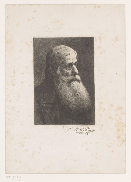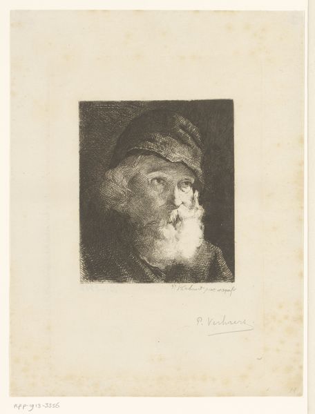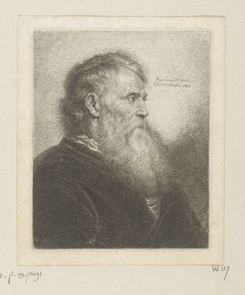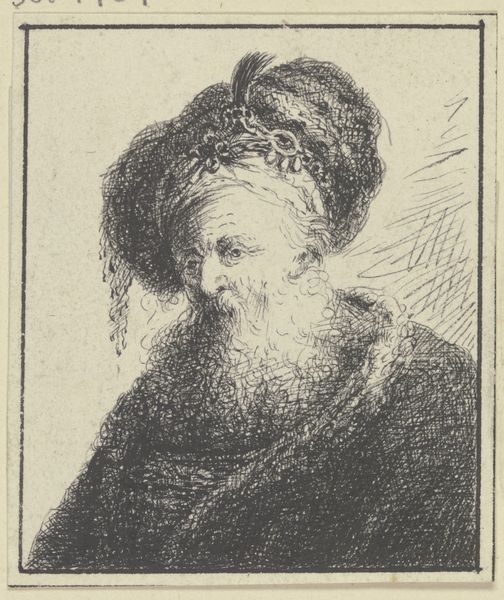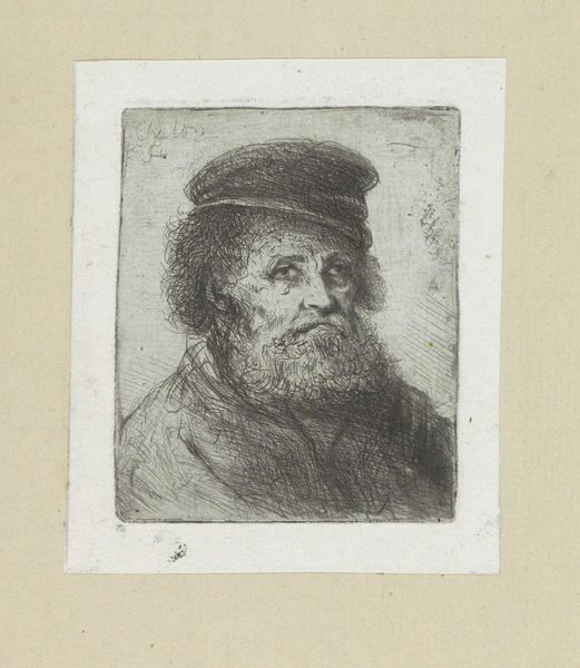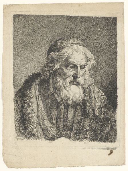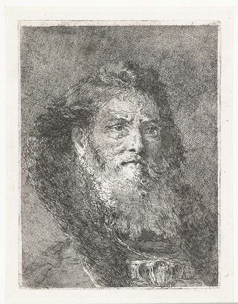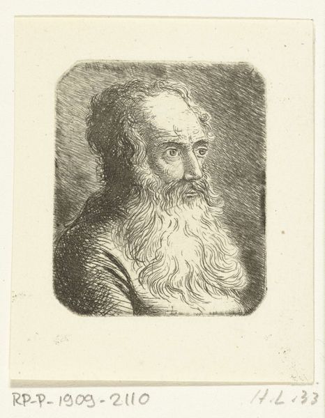 Editor: Here we have "Old Man with a Beard," an etching by Ferdinand Bol, dating from around 1626 to 1680, now hanging in the Rijksmuseum. There's such a deep pensiveness to this portrait. What strikes you about it? Curator: The face, framed in that oval, becomes an emblem. Think about beards. They've historically signified wisdom, age, even authority. This isn't just a portrait of an individual; it's evoking centuries of cultural memory associated with facial hair. What readings might derive from this archetype? Editor: So, you see him as representing something larger than just himself, then? Curator: Absolutely. The etching medium also adds layers. Printmaking allowed images to circulate, democratizing them, so to speak. Think about who would commission, own, and circulate a print like this? What kind of meaning does the print give the sitter, beyond the scope of the piece itself? Editor: The replication could transform the meaning. Maybe the sitter saw the rendering and replication as validation? It’s interesting to consider what that etching might have meant to the sitter during his lifetime. Curator: Precisely. Now, how do you think this fits within the Baroque period, stylistically? Editor: Well, Baroque art often featured dramatic lighting and intense emotion. The deep shadows in this etching definitely suggest a sense of drama. Curator: And what feelings do those shadows evoke in you, personally? Consider them beyond the purely aesthetic or art historical... Editor: Melancholy, maybe even a bit of fear. The eyes are shadowed, as if peering out of the dark. Curator: Precisely! Bol is tapping into something primal here. We're all carrying inherited ideas around with us and these inherited cultural archetypes—wisdom, old age, even patriarchal authority—are embodied within the cultural memory that etching helped disseminate. It’s powerful stuff. Editor: It really is. It makes me think differently about how portraits can function in society.