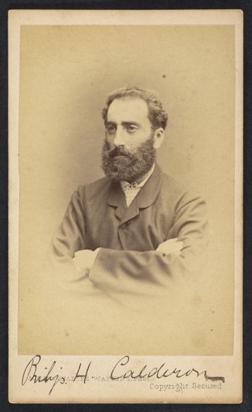 Curator: Here we have a "Studioportret van een man met een lange baard," or studio portrait of a man with a long beard, created between 1863 and 1866. The Abdullah Frères were responsible for its making, and the work survives as a daguerreotype in the Rijksmuseum collection. Editor: I'm struck immediately by the sitter's posture. It's so studied, almost nonchalant, leaning casually against that ornate table. There's a sense of theatricality to the whole composition, a deliberate presentation. Curator: Absolutely. Think about the burgeoning middle class and its desire for social affirmation through images in that period. The man’s attire, his carefully cultivated beard—all declare his status and sophistication. That dark, closed coat and bow tie have that desired serious air of the time. The long, somber face expresses the inner state expected from a male role-model figure. Editor: The daguerreotype, with its inherent clarity, almost heightens that effect. It captures the details of his suit, the texture of his beard. This sharpness contrasts with the soft background. The gaze of the sitter straight into the camera must also have had quite an impact then. There is a sense of self-awareness there. Curator: Indeed, the image served as both personal memento and a public declaration. Look closer: besides his hat and statue-like piece, there’s the table itself, an overt symbol of wealth and perhaps intellect. The details included create that persona and self-image intended to remain with his loved ones and wider circles for many generations. Editor: It makes you wonder about the person beyond the carefully constructed image. Did that heavy beard and serious stare hide a sense of humor? Were these elements meant to convey social and family status, personal strength, moral strength, or a potent combination of the three? Curator: And the power of that sustained image is one we feel even today. Photography immortalized this gentleman in that one single way he and society then wished. The work shows us a carefully constructed performance of masculinity in the 19th century. Editor: A lasting and impressive visual encapsulation, carefully composed.