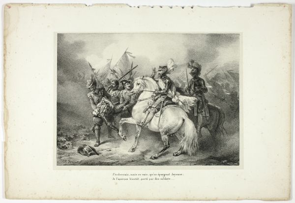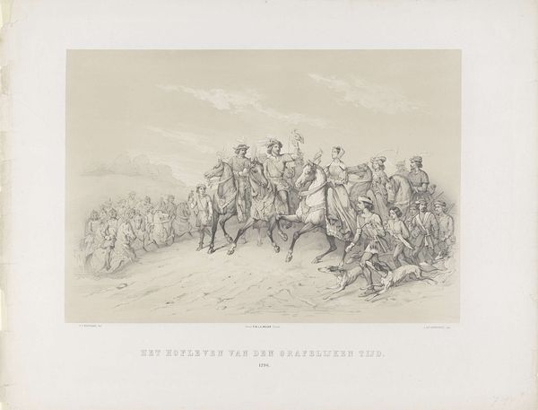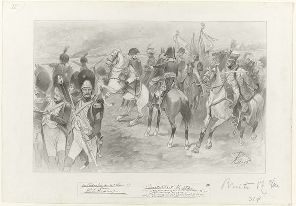 Carel Christiaan Antony Last created this work, "Karavaan soldaten te paard," using graphite, likely in the mid-19th century. The immediate visual impression is one of muted activity, a quiet procession rendered in subtle gradations of grey. The composition unfolds laterally, guiding the eye from left to right across a landscape filled with soldiers on horseback and foot. The artist employs line and tonal variation to create depth and suggest movement. The figures, though small, are meticulously detailed, giving a sense of individual presence within the larger group. The structural arrangement of the caravan, receding into the distance, indicates not only spatial depth but also a sense of continuous journey or passage. Last skillfully uses light and shadow to model the forms, creating a play of contrasts that articulates the textures of the uniforms, horses, and terrain. This formal quality underscores the work's ability to evoke a specific atmosphere and mood, drawing the viewer into a narrative that is both historical and timeless.