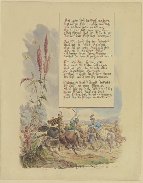 Editor: This is "Der Rheingraf mit seinen Gefährten" by Eugen Klimsch, likely from the 19th century, rendered in ink and watercolor. There's almost a storybook quality to it. The scene, the riders, even the text in the upper portion—it gives off a nostalgic feeling, almost theatrical. How do you interpret this work? Curator: The theatricality is a great observation! Think about the 19th century and the rise of Romanticism, along with burgeoning national identities. History painting like this wasn’t just about documenting events, it was about constructing a narrative, shaping a collective memory. Notice the prominent text – seemingly a poem? Consider it as framing the visual narrative, adding layers of meaning and moral instruction to this representation of Rhineland history. How do you think the context of this being displayed, perhaps in a bourgeois home, changes its meaning? Editor: That's fascinating. I hadn’t considered how display alters the piece. Placing it in a home transforms it into a kind of historical validation for the homeowner, like claiming a connection to a glorious past. Curator: Exactly! It’s about associating with that imagined history and projecting an identity. Moreover, look at the composition. The landscape itself isn't just background; it evokes a specific regional identity linked to ideas of Germanic origins, the power of the natural world but in conjunction with its influence in establishing their statehood, therefore impacting future generations to embrace its value. Editor: So, it's a visual and textual argument for a specific kind of national identity? It's not just a picture, but almost a political statement within a domestic setting. Curator: Precisely. By controlling how their past is envisioned, institutions and individuals exert soft power influencing public thought within the societal landscape of the Rhineland. What I wonder is: whose history does this foreground and whose does it potentially erase or marginalize? Editor: That really reframes my perspective. It’s more than just a charming historical scene, it is carefully constructed with significant contextual weight, that promotes regional historical preservation within households! Thanks for pointing that out. Curator: My pleasure. Recognizing how art like this functions within its socio-political landscape adds depth to how we view it, not just as art, but as active participants in shaping our understandings of the past.