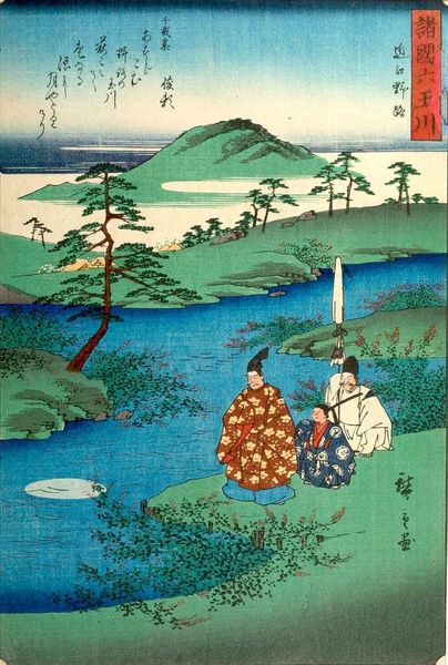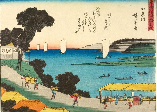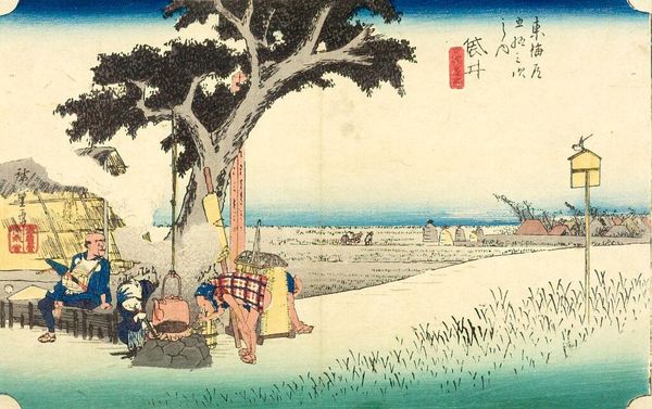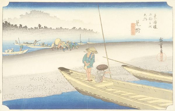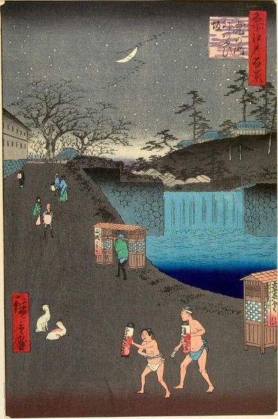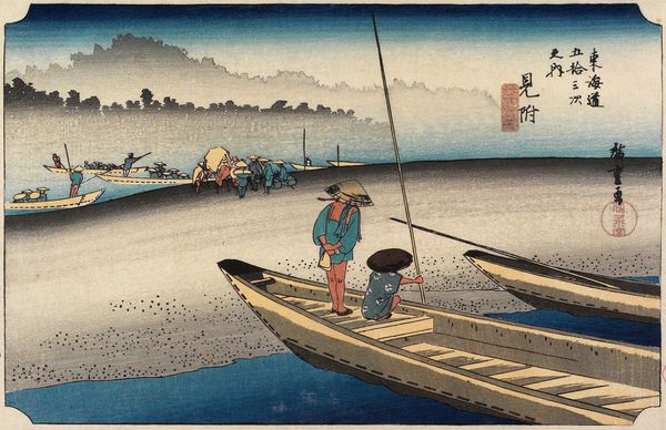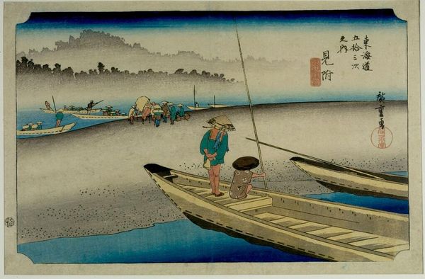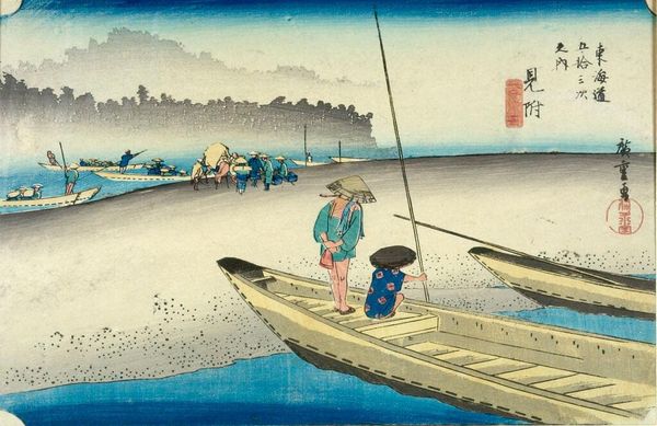 Editor: This is "Yujima Tenjin, Enryu-Gawa No Dzu" from Thirty-Six Views of Yedo, by Utagawa Hiroshige. I’m immediately drawn to the contrast between the detailed foreground and the misty background. What strikes you about this work? Curator: The woodblock printing process itself is key here. Consider the labor involved in carving these blocks and the social function of distributing these images widely, making landscapes accessible and consumable to a broad audience. Editor: So, you're saying the value lies in its accessibility through production? Curator: Precisely. The materiality of the print and its availability speak volumes about the culture of Edo period Japan and the commodification of its views. Editor: I see it now! Thinking about the process really does change how you see the image.