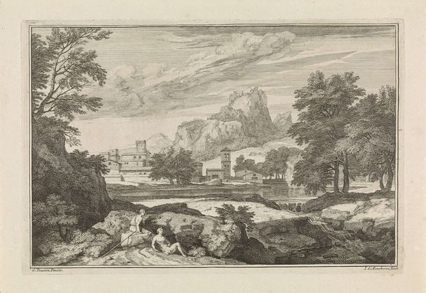 Giovanni Volpato made this print of a river landscape using etching and burin techniques. We see a bustling scene of commerce and leisure, typical of 18th-century Italian landscapes. Volpato was part of a generation of artists working in the shadow of the Grand Tour, a cultural phenomenon where wealthy Europeans, especially Brits, toured Italy to soak up its classical heritage. His work catered to this market, creating picturesque scenes of Italy that tourists could take home as souvenirs. The image creates meaning through visual codes of class and labor: figures of men point towards ships, directing commercial enterprise in the distance. Others fish on the shore, while upper-class figures rest under a tree. These details would have resonated with the social hierarchies of Volpato's time. To understand this artwork better, we can research the history of the Grand Tour and the market for Italian landscape prints in the 18th century. Studying the artist's biography and other prints will also reveal his role within the artistic institutions of his day. Ultimately, the meaning of this artwork is intertwined with the social and economic conditions in which it was produced and consumed.