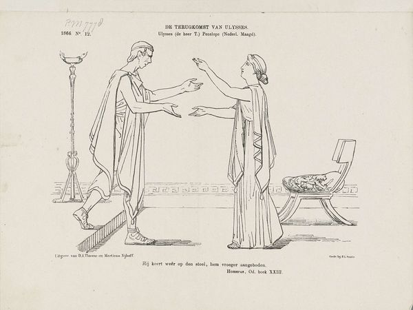 Curator: Looking at John Flaxman’s series of engravings from 1795 to 1817 illustrating Homer, Aeschylus, and Hesiod, one is struck by the linearity and simplicity. Editor: My first impression is that these figures, especially in this plate showing Ulysses at the table of Circe, appear strikingly detached, almost floating in a silent space despite being a narrative scene. Curator: Precisely. Flaxman’s process involved stripping down the compositions to their most essential lines, reflecting the Neoclassical emphasis on form and ideal beauty. These engravings were, in a sense, mass-produced; this allowed for wider consumption and dissemination of classical narratives, reaching audiences beyond the elite. How do you interpret that silence? Editor: I see the silence as heavy with the weight of the choices characters have to make within these ancient myths. Ulysses looks deeply troubled here. Flaxman captures his psychological turmoil so economically, making me think about themes of gender, power and isolation present within the narrative. The social isolation experienced by both Ulysses and Circe is quite noticeable. Curator: It’s fascinating how the medium—engraving—a relatively accessible printing method at the time, contributed to shaping a visual culture steeped in classical narratives. Consider the labor involved in creating these detailed line drawings and transferring them to plates for reproduction; this speaks volumes about the dedication to classical ideals present during this era. Flaxman and other printmakers embraced engraving as an essential tool in the transmission of knowledge during the late 18th and early 19th centuries. Editor: And within those narrative choices lies so much unspoken social commentary. We should think critically about how these classical stories intersect with themes of colonialism, empire, and even early formations of modern European identity. The simplicity allows us, as contemporary viewers, to see these figures in our reflection. Curator: So, while Flaxman’s austere line might appear detached, it opened doors to exploring shared artistic ideals on a much larger scale. It democratized art making and viewing, which I find truly noteworthy. Editor: It is an invitation to consider how we understand ourselves within a continuum of shared cultural narratives. Definitely food for thought.