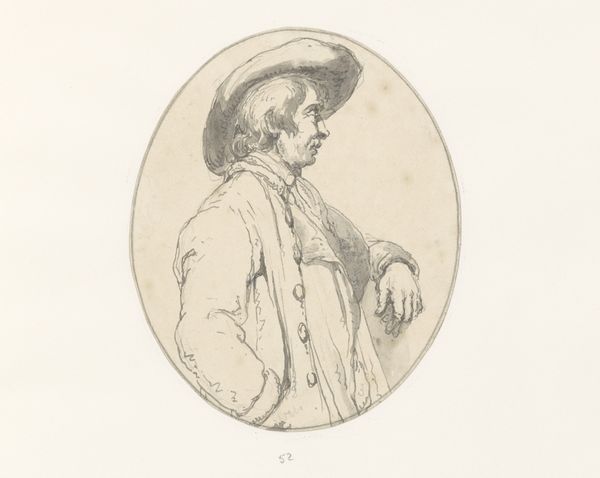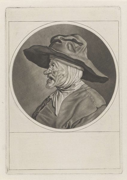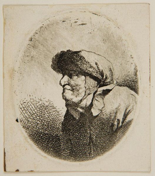 Curator: This finely detailed etching, "Man with a Hat," was created by Johann Georg Wille in 1748. It's a small work, but remarkably expressive. Editor: He looks like he's seen a few things, doesn't he? World-weary, perhaps a touch mischievous. The hat and scarf give him a slightly theatrical air. Curator: It's interesting how Wille uses such precise lines to create a sense of texture, especially in the fabric. The way the light catches his face is masterful. He truly looks like some kind of folk hero. Editor: Absolutely. And those shadows, so delicate! You know, the hat itself reminds me of depictions of pilgrims. I can't help but wonder if the man's wearing some sort of spiritual symbolism. Curator: That's a lovely thought. What I love most, though, is the honesty of the portrait. It doesn't try to flatter; it just presents a person, wrinkles and all. Editor: Yes, it’s as if Wille captured not just a face, but a story etched in time. Beautiful and a little bit sad, like life itself.