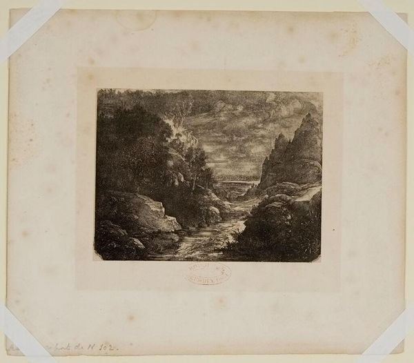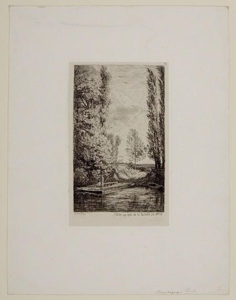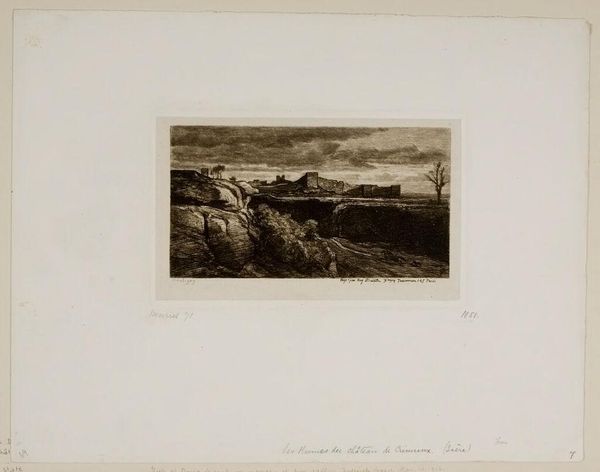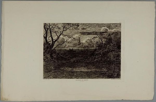 Editor: This is Rodolphe Bresdin's "La cité lointaine (Le marécage)," or "The Distant City (The Swamp)". It's difficult to date precisely. The etching itself is incredibly detailed. What structural elements define your reading of this print? Curator: Observe how Bresdin employs dense, almost suffocating textures. The composition leads the eye, yes, but to what? Not clarity, but a blurred horizon, a city distant not only in space but in legibility. Editor: So, the "distant city" isn't the point? Curator: Precisely. It's the journey through the swamp, the process of looking, rendered through Bresdin's masterful control of light and dark, that truly matters. What do you think of the use of light? Editor: It’s brooding, almost unsettling, but the observation of textures is where the real skill lies. Curator: Indeed. Bresdin transforms a simple landscape into an introspective journey.