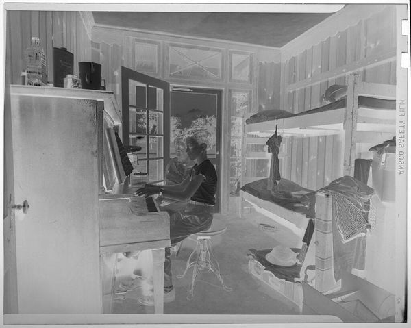Curator: This photograph, currently titled "Untitled (man at desk with busts)," was created by Peter James Studio. It's a silver gelatin print, measuring about 4 by 5 inches and is part of the Harvard Art Museums collection. Editor: The inverted tones create such a ghostly effect. It looks like the man is communing with his ancestors, or maybe just overwhelmed by the weight of history, judging by those busts looming behind him. Curator: Well, portraits and busts were often used to convey authority and legacy, reflecting the subject's place in society. I wonder what this man's connection to these figures is. Editor: Maybe they're his muses? Or maybe he's just trying to finish his taxes with the pressure of dead philosophers staring him down. It's a wonderfully awkward, revealing moment. Curator: It makes you consider how we build our personal narratives through material culture. Editor: Exactly. It makes you think about your own space and the silent conversations you have with the objects around you.