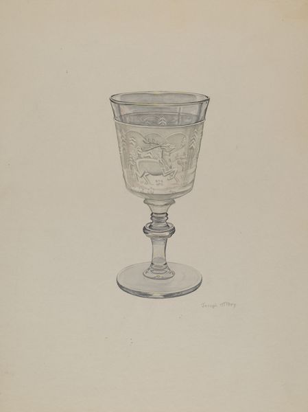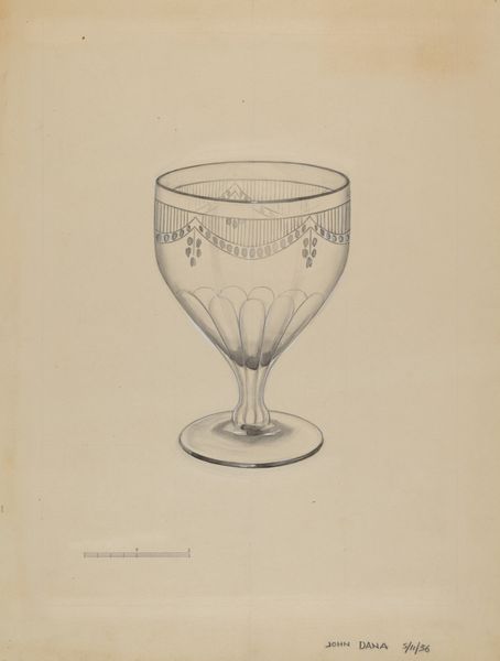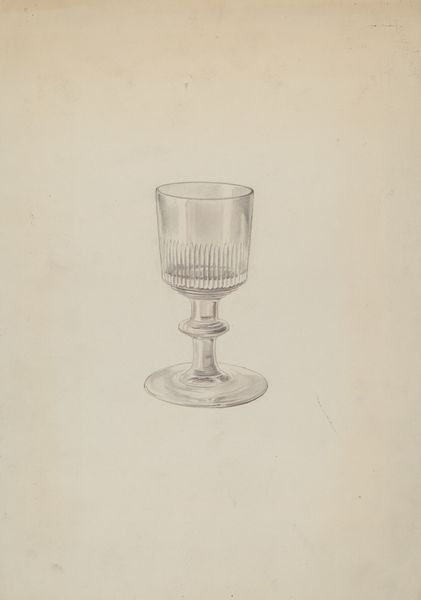 Editor: Here we have "Goblet," a watercolor and pencil drawing created around 1936 by Janet Riza. What immediately strikes me is how delicately the artist captured the light playing across the glass. What stands out to you as you view it? Curator: The goblet, a vessel, is almost universally a symbol of both containment and potential, isn’t it? Holding water, wine…even poison. Editor: Yes, definitely! It seems so simple, yet charged. Curator: Indeed! Its shape - the curve, the stem - suggests both femininity and uprightness. In many cultures, the goblet features prominently in rituals – think communion or ceremonial toasts. Look at the interior lines of the cup and they begin to mimic figures standing, in fellowship. Do you think it reflects that social importance? Editor: It really might. It almost feels like it's less about the glass itself, and more about what it represents; it's elevated and refined. But I don't immediately get the fellowship. Curator: Perhaps fellowship is the wrong word, and simply togetherness might be more apt, it has associations with both sacred and secular ceremonies. This piece freezes time and allows us to ponder connections – to the past, to our communities, and to ourselves. And that seems especially important considering when it was made, at a moment of political turmoil in Europe and not too long after The Great Depression. It gives a symbol of luxury a real presence and heft. What a lovely subversion of the traditional still-life! Editor: Wow, I never considered the context. I see the goblet differently now – not just as an object, but as a silent witness. Thank you for expanding my understanding! Curator: And thank you for your fresh eyes and willingness to question. It is what keeps these cultural symbols and memories alive.