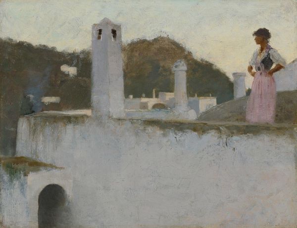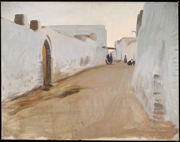 Curator: Here we have John Singer Sargent’s "Moorish Buildings in Sunlight," painted circa 1879-1880, rendered in oil. Editor: It's…dusty. The colour palette, the subject itself…it evokes a feeling of parched heat and decay. Curator: Indeed, the artist has captured the stark contrast between light and shadow, characteristic of many North African landscapes. Notice how the sunlight dominates the architectural forms, almost erasing detail. Editor: Right, Sargent’s intense rendering of light performs a sort of visual erasure of the inhabitants themselves. These are not neutral depictions; the orientalist gaze flattens and essentializes an entire culture. Curator: Undoubtedly, but I am drawn to how the composition relies on geometric masses, juxtaposing them masterfully. The rectangularity of the buildings, punctuated by the curved archway… the semiotic interplay of shapes suggests an ordered existence. Editor: But for whom is that order imposed? We have to acknowledge the colonial dynamics inherent in a Western artist's depiction of North Africa. This isn’t merely an aesthetic exercise; it's about power, about who gets to represent whom. Curator: Agreed, yet consider Sargent’s technique. The loose brushwork, the broken colour, anticipate later impressionist styles. The work stands alone in its depiction of transient light effects and its confident paint handling. Editor: The impressionistic technique does soften some of the harder edges, lending a veneer of romanticism to the scene, which, arguably, further masks the underlying political tensions. We have to question if this approach idealises a lived reality of inequality. Curator: Ultimately, “Moorish Buildings in Sunlight” offers both a formal exercise in depicting light and a glimpse into the complex socio-political dynamics of its time. Editor: It forces us to contend with the beauty of the composition and light while wrestling with the problematic history of representation. A potent reminder that even seemingly simple depictions are charged with ideological implications.
