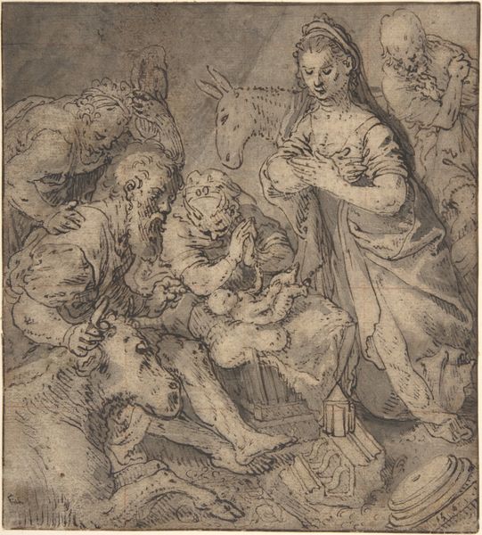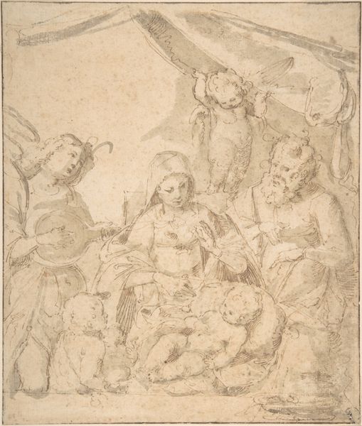 Editor: We're looking at "The Holy Family with Saint Philip Neri in Adoration, an Angel, and Putti," a drawing from 1649 by Giacinto Gimignani. The first thing I notice is how the lines create such a sense of movement. What strikes you about the composition of this piece? Curator: Indeed. Note the masterful employment of line. Observe how the dynamism isn’t solely rendered through active poses. It’s equally driven by the swirling lines of the drapery and the subtle gradations in shading. The artist employs hatching and cross-hatching, thereby fashioning a complex tonal landscape. Have you also marked the strategic use of empty space? Editor: You mean the way the figures are grouped? Curator: Precisely. Notice how the proximity and positioning of figures relative to these blank spaces direct the gaze. This lends itself to a feeling of expansiveness even within the confined area of the paper. Moreover, let’s contemplate the lines themselves: thin and fragile in certain sections to dense and weighty elsewhere. How might you describe their emotional impact on the viewer? Editor: I guess the varied lines create a tension and contribute to a feeling of spiritual intensity. There's almost a sense of anticipation to it. Curator: Quite perceptive. The contrast serves to animate the subject, and the semiotic tension you detected suggests a state of becoming. Gimignani's grasp of the materials is formidable. The texture conjured is far greater than the sum of its constituent lines. Editor: I see that now. I'll definitely pay closer attention to how line work impacts my emotional reaction from now on. Curator: As will I. Thank you for that valuable insight.