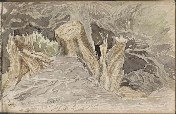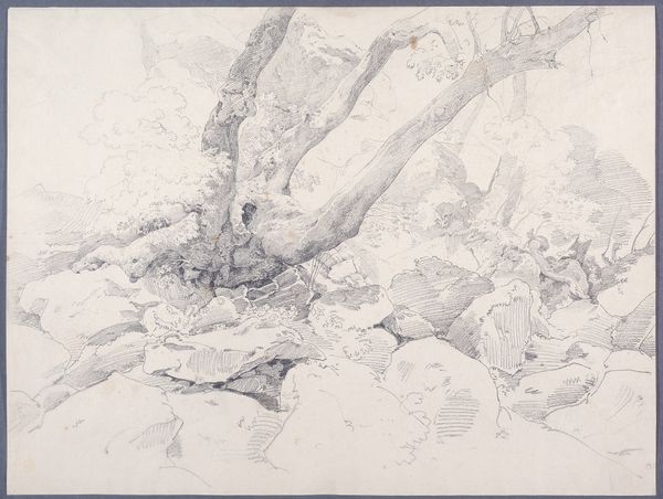 Editor: Right now, we’re looking at "Wasserfall zwischen Felsblöcken," or "Waterfall Among Boulders," made around 1834 by Carl Morgenstern. It's a delicate landscape done with pencil, graphite, and watercolor. It gives me a feeling of quiet contemplation… like a hidden place. What do you see in it? Curator: It’s as if Morgenstern invites us to witness a moment of intimate communion between water and stone. I feel the cool, damp breath of the rocks – almost like nature exhaling. Think of the Romantic era’s fascination with the sublime, with nature's overwhelming power. He wasn't just painting a pretty waterfall, was he? Instead, it feels like a search for the essence of nature itself. I'd like to know, does this conjure a narrative within you? Do the rocks whisper stories of ancient times? Editor: Yes, they do. I can almost hear the water trickling through them and maybe a faint echo. It definitely has this timeless quality. Like, these rocks have been here forever and will stay here long after us. Curator: Precisely! And did you notice how he guides your eye? The water, a silver thread, leads you deeper and deeper...almost to an unknown destination. Editor: It definitely draws me in, further into the painting, but it’s also so simple. It’s really just rocks and water, isn't it? Yet, I get lost. Curator: That's the brilliance, isn't it? To find the profound in the everyday. Next time you are outdoors, remember Morgenstern and this secret world within a stone! Editor: I definitely will. Thanks for that insight!