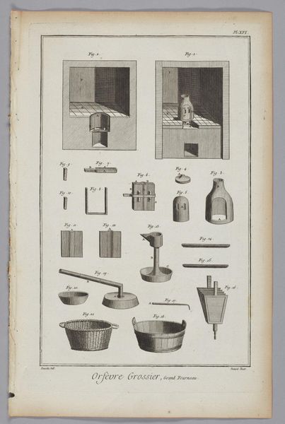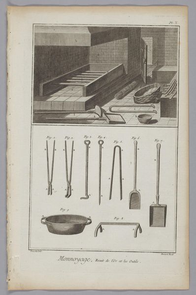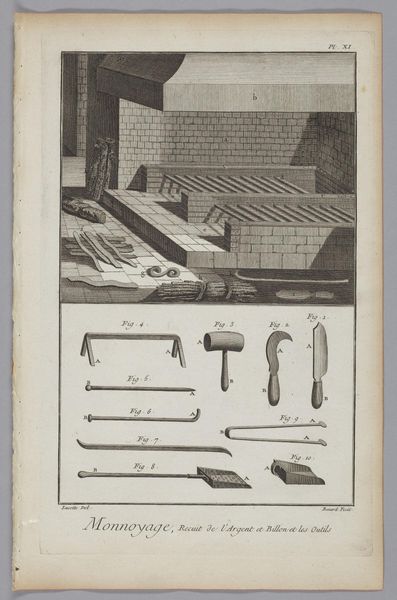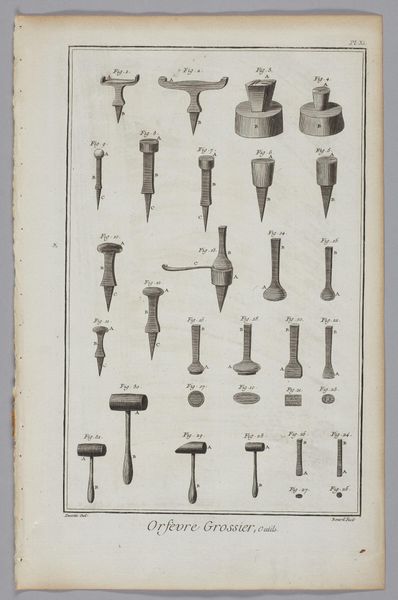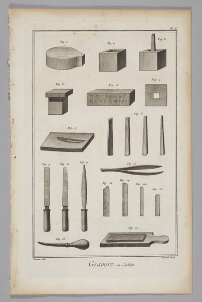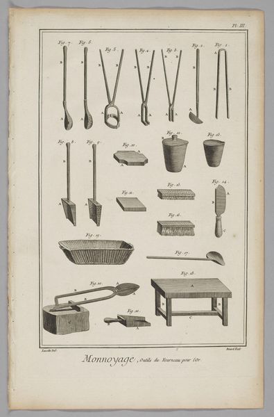 This is Benoit Louis Prevost's engraving, "Card-Maker," one of the many plates commissioned for the "Encyclopédie." Its visual structure is divided into two distinct registers. Above, tools are meticulously arranged, each rendered with precise detail against the stark white background. Below, a table is depicted in linear perspective, displaying the instruments and materials necessary for crafting playing cards. This piece is not merely an objective record; it's an articulation of Enlightenment ideals, classifying and ordering the world through visual means. Each tool, from punches to brushes, embodies a stage in the card-making process, transforming raw materials into objects of leisure and commerce. The contrast between the ordered array of tools and the active workspace suggests a transition from abstract knowledge to concrete application. Consider how the act of cataloging becomes a form of control and understanding. The clean lines and organized composition reflect the period’s obsession with rationality and empirical observation. The print invites us to contemplate the structures that underpin not only artisanal practices but also broader systems of knowledge and power.