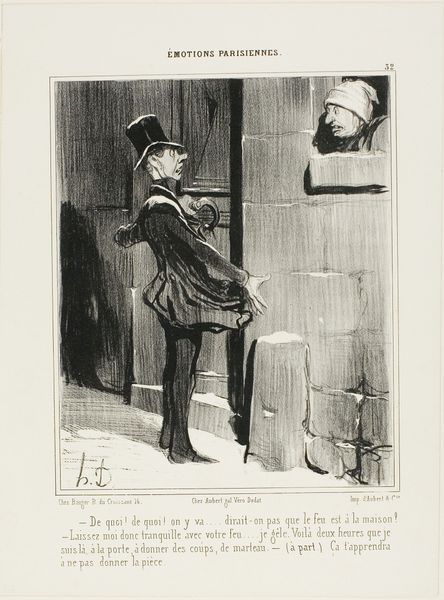 Curator: Honore Daumier, a prominent figure known for his satirical lithographs, is the artist behind this artwork. The title? "Well done! That's how to do a tie." Editor: The immediate feeling I get is one of sly humor—there's something quite theatrical about this character preening himself. Curator: Daumier often employed caricature to critique the bourgeoisie. The tie here becomes a symbol of status, a carefully constructed performance. Editor: It's interesting how the figure seems almost disembodied, elongated, existing solely to uphold a certain ideal of masculine elegance that is ultimately quite absurd. Curator: He is a self-made man, or perhaps a man trying to make himself. The tie is a performative act, linking to societal expectations and visual signifiers of self-worth. Editor: Exactly, it’s a reflection on the ridiculous rituals of societal status. It suggests that appearances matter more than substance. Curator: Daumier really captured the era's shifting values, didn't he? Editor: Absolutely. It's a cynical, yet enduring, commentary.