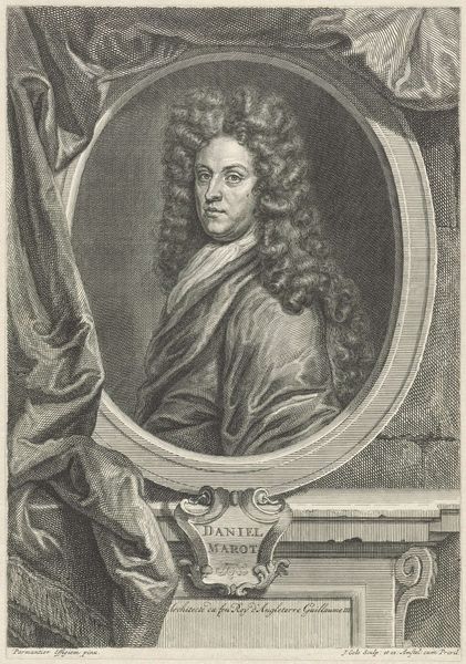 Curator: This is Jacobus Houbraken’s engraving of George, Prince of Denmark, housed here at the Harvard Art Museums. Editor: It’s surprisingly detailed. I am immediately drawn to the fineness of the lines used to depict his wig – it’s almost overwhelming. Curator: The wig definitely speaks to a certain era, and the armor peeking from beneath his cravat signals power, doesn’t it? Symbols that resonate with status. Editor: More than status, I see the process of its making as crucial to understanding power. It’s a print; it was made for distribution. What does it mean to reproduce royal imagery? Curator: Ah, dissemination of the royal image… how interesting. He is forever preserved, made an icon. And consider the anchor – a symbol of hope, steadfastness, and perhaps his role in naval affairs? Editor: The anchor is such a heavy, manufactured object, isn’t it? It makes me think about the labor needed to produce and use it, and the economic networks that supported the Prince. Curator: It’s a powerful reminder of the layers of meaning embedded within seemingly straightforward portraiture. Editor: Indeed, seeing the artwork through the lens of its materiality opens up entirely new avenues of understanding.