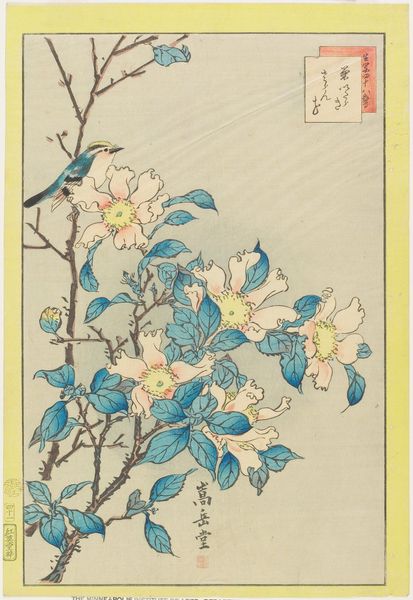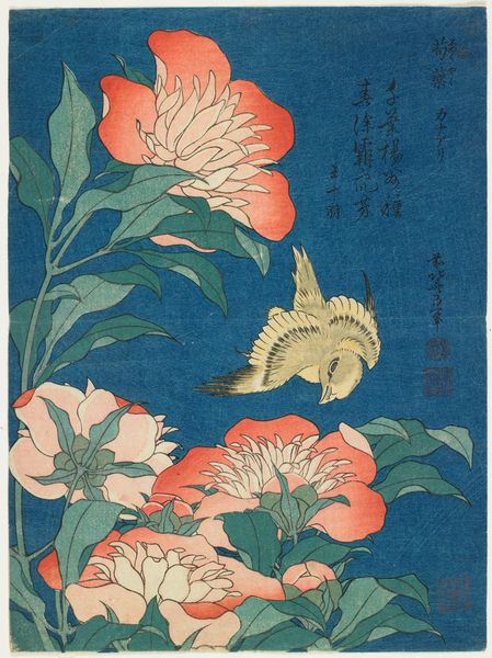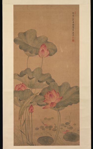 Editor: So, here we have Ohara Koson’s "Flowering Water Lily," made sometime between 1920 and 1930. It's a woodblock print on paper, and I find it quite serene, almost dreamlike. What stands out to you when you look at this piece? Curator: I’m drawn to how Koson uses the water lily. Across many cultures, the lotus, or water lily, is deeply symbolic. Think of its roots in muddy waters and how it emerges, pristine, towards the light. It’s a powerful symbol of purity, rebirth, and spiritual awakening, right? Does that reading change how you perceive the ‘serenity’ you mentioned? Editor: It does! I was only looking at the pretty pink flowers, but knowing that gives it a whole new depth. The idea of emerging from something dark into light is much more compelling. So the flower isn't just a flower... it's a…message? Curator: Exactly. It's about transformation. Consider how the ukiyo-e tradition, even as it depicts everyday scenes, often holds these layers of meaning. The composition itself guides our eye upward, doesn't it? Towards the blooming flowers from the leaves below the surface? Editor: I see that now. It’s like a visual story. The buds, the leaves and the fully opened flower… it's a life cycle laid out. Do you think people viewing this at the time period would have interpreted it differently? Curator: It's likely they would have recognized the lotus symbolism instantly, given the prevalence of Buddhist imagery. What do you take away now, understanding both its serenity and its symbolism? Editor: It feels less like a pretty picture and more like a reminder of potential. Even within the most muddled circumstances, beauty can emerge. I hadn't considered the spiritual depth a seemingly simple image could possess. Curator: And that's the enduring power of visual symbols, isn't it?