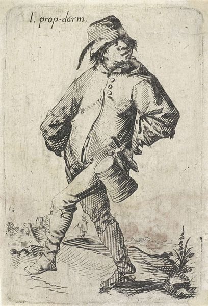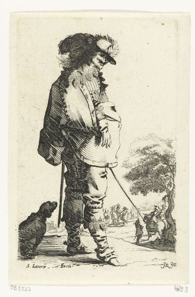 Salomon Savery created this etching of a standing cavalier with a battle scene in the background. Notice how Savery uses dense cross-hatching to define the cavalier’s figure, creating volume and texture in his clothing, particularly the elaborate hat and boots. The stark contrast between the foreground figure and the more delicately rendered background establishes a clear spatial hierarchy. Savery destabilizes the traditional heroic portrayal of military figures. The cavalier, though richly dressed, is depicted with a somewhat stooped posture, almost as if detached from the active battle scene behind him. The battle itself, rendered in miniature, serves more as a backdrop than a focal point, questioning the glorification of war. The linear precision of the etching emphasizes the material qualities of the print. The medium serves to highlight the constructed nature of representation. The dense lines not only describe form but also draw attention to the artificiality inherent in translating three-dimensional reality into a two-dimensional image.