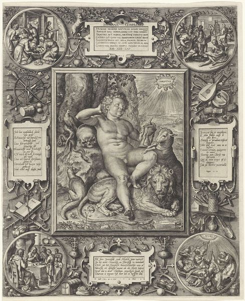 Curator: Looking at this dramatic scene, my first impression is one of turmoil and upheaval. The turbulent clouds and the central figure being tossed about give it a very chaotic feeling. Editor: Indeed. We are looking at “Punitio Tirannorum,” or "The Punishment of Tyrants", by Hendrick Goltzius, likely created sometime between 1570 and 1617. It’s an engraving, currently held at the Metropolitan Museum of Art. What draws me is the clear socio-political critique being offered here through allegory. Curator: The image certainly presents a vivid depiction of divine retribution. We see the tyrant overthrown, but there’s a symbolic language being spoken here. Editor: Precisely. Tyrants, historically and today, cling to power, but this work boldly suggests that abuse is never sustainable and inevitably collapses. Consider the classical notion of the "wheel of fortune," where fortune raises a figure to the apex, then violently hurls them down. Is Goltzius illustrating such a cycle? The tyrant here, cast down amid battle and ruin, reminds us of that universal fate. Curator: I see the broader scope. And look at the smaller scenes in the border. Each vignette reinforces this idea of justice being delivered. It’s a visual reinforcement, a cultural memory of past tyrants meeting their end. Even the animals incorporated feel allegorical, adding layers to our understanding. Editor: The use of the animal further underscores this historical power struggle as well as how this allegory functions, revealing much about perceptions of good and evil that Goltzius and his audiences found recognizable and sensible. What appears natural to one culture—or social stratum within a culture—can be an outrage to another. This composition allows us to contemplate this as both a historic and contemporary theme. Curator: Looking closer, I’m struck by how Goltzius managed to pack so much symbolism and narrative into one piece. Editor: This definitely encourages us to reconsider, doesn't it, how persistent themes of power, justice, and moral downfall show up in art throughout history. It's about cyclical patterns, not isolated incidents. Curator: Agreed. Goltzius gives us much to reflect on—the patterns within, the historical reminders, and what it suggests about cultural expectations around leadership and abuse of power. Editor: Absolutely, it provokes introspection and makes clear how powerfully art speaks, both within and far beyond, its own historical moment.