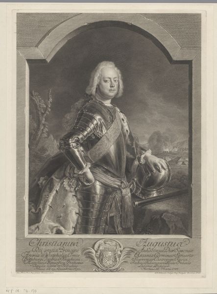 This is Jacob Houbraken’s portrait of Ferdinand, Duke of Brunswick-Lüneburg, made using engraving. The visual experience is dominated by intricate detailing and textures created through fine lines. The composition meticulously presents the Duke in full regalia, evoking a sense of formality and power. Houbraken’s mastery of line work creates a complex interplay of light and shadow, defining the textures of fabric, fur, and metal. The structural arrangement of the portrait, with its symmetrical balance and detailed ornamentation, reflects the hierarchical values of the era. Semiotically, each element—the ermine cloak, the ornate chain, the sword—functions as a signifier of status and authority. The artwork challenges fixed meanings by inviting us to decode the visual language of power. The Duke's posture and the arrangement of symbols function not merely as aesthetic choices but as deliberate constructions of identity and authority. The engraving serves as an intriguing lens through which to examine the cultural codes embedded in portraiture.