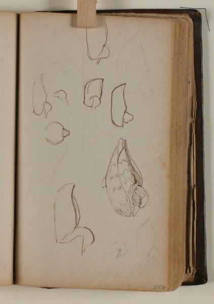 Curator: So, here we have Niels Larsen Stevns' "Sketch of Cones and Plants," dating from somewhere between 1906 and 1910. It’s a pencil drawing, full of quick, impressionistic lines. Editor: There’s an appealing modesty to it, isn’t there? That humble pencil on aged paper… it's whispering, not shouting. It’s interesting how he captures these pinecones with a sort of…architectural rigor, almost crystalline. Curator: Indeed. Think of cones and seedlings – primal symbols of fertility, rebirth, and endurance. These little subjects become, in Stevns' rendering, like blueprints of nature’s ingenuity. It makes one ponder: were they intended simply as studies or did Stevns see something deeper in the structure? Editor: Perhaps a little of both? The upper cones certainly suggest this interest in underlying structure, almost deconstructing the natural form into geometric facets, echoing a very proto-Cubist approach. It's as if he were trying to distill the essence of 'coneness'! Then juxtapose that against the looser depiction of emerging plants and buds below. The lines quiver with nascent life. Curator: I find that dynamic tension potent – that almost scientific observation wrestling with a pure, creative expression. It's also fascinating how economical his mark-making is. The slight variations create such a rich sense of texture in the cones. The very definition of "less is more." Editor: Yes! The economy speaks volumes, especially considering this was an era where detailed realism still held sway. This work anticipates a different sensibility entirely. Perhaps he's trying to get down to the fundamental geometric language of life. Curator: A truly captivating piece then – unassuming yet so potent. Stevns invites us to observe the most ordinary details with new wonder. Editor: Agreed. And consider that interplay he creates—revealing that nature's quiet observation also harbors dynamic forces.