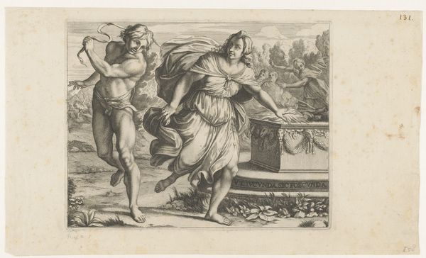 Editor: This engraving from 1663 by Giuseppe Maria Mitelli, titled "Trojans Capture Sinon", is fascinating. The frenzied energy practically jumps off the page. The expressions are quite dramatic. What do you see in this piece, beyond the immediate chaos? Curator: Indeed, the chaos is central. Consider Sinon. Here, he embodies the archetype of the deceptive outsider, a figure distrusted across cultures and eras. The Trojans, blinded by pride and manipulated by Sinon’s false narrative, drag him. What symbols resonate most strongly with you from the classical narrative? Editor: The horse, certainly. But here it’s in the background. More than a symbol, it feels more like the embodiment of impending doom lurking in the distance! It does make me wonder if the artist assumes we know the whole story and therefore can appreciate the weight of this very loaded symbol! Curator: Precisely. Mitelli counts on the cultural memory of his audience, their familiarity with Virgil's Aeneid, to give weight to the scene. This speaks to how shared narratives shape our understanding of events, past and present, no? Think of propaganda… the “stories” nations tell to rally people together. Editor: Wow, that's really insightful, how visual symbols link the Trojan War to modern ideas of nationhood and deception. Curator: The longevity of Sinon’s archetype forces us to consider why societies continue to fear and demonize the “other”. This is why the images resonate, because it exposes a fundamental psychology, even today. Editor: That’s given me a lot to consider about how images build on one another over time. Thanks so much. Curator: My pleasure.