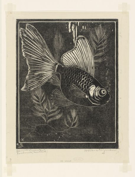 Curator: Immediately, this artwork feels prehistoric yet whimsical! Editor: It does! We're looking at Dora Kaminsky's "Fossil Fish," created around 1930. It is an aquatint and linocut print. The blend of graphic arts and printmaking techniques brings an element of texture and depth to these underwater creatures. Curator: I'm drawn to how these fish, rendered with such tangible, almost crude, marks, evoke a sense of a lost world. Notice how Kaminsky uses symbolic imagery – not just the fish themselves but their stylization – hinting at something primeval lurking beneath the surface of our collective memory. Editor: Exactly. It makes me wonder, does it symbolize some deeper layer of consciousness, of the hidden self or maybe even childhood imaginings, all swimming beneath the surface? Curator: Precisely. Water, across cultures, often signifies the unconscious. And fishes? They can represent everything from fertility to adaptability. But here, there's a fossilized quality. What once thrived is now fixed, examined. There’s something elegiac in the depiction. Editor: Yes! Plus the colour choices feel slightly off-kilter. The overall mood is… well, subtly unsettling. Like finding a beautiful but bizarre artifact. I'm interested, does Kaminsky intentionally give this sense to show us our world through slightly alienated eyes? Curator: Perhaps to consider our own relationship with time and the legacy of life, represented by those ‘fossilized’ images, so it invites a profound consideration. We recognize this archetypal symbology whether we're conscious of it or not. Editor: It certainly does get your mind churning. Well, looking at this piece through a psycho-historical lens gives me new insight into its peculiar emotional resonance. Curator: Indeed, art is just a conversation between time periods; and Dora Kaminsky began that conversation with grace.