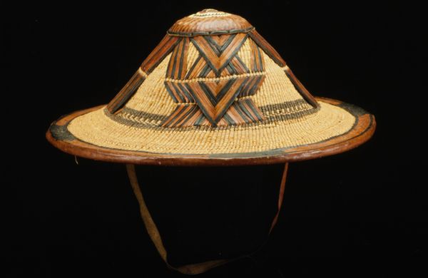 Curator: What strikes me immediately about this "Ceremonial Hat" is its surprising modernity. The lines are so clean, the colour palette bold. Editor: Yes, there's a fascinating tension between the raw, natural fibres and that striking red, isn’t there? I'm immediately wondering about the social significance. Curator: It is estimated to have been made around the 20th century, its materials consisting of woven fibers, textile, and what appears to be some ceramic ornamentation. The weaving displays strong ancestral linkages to the indigenous communities of the Americas. Editor: Given the likely cultural origin and its decorative elements, how might this hat be situated within contemporary Indigenous identity and representation? What stories does it conceal? Curator: That's insightful. Headwear, across countless cultures, signifies status and power. I see strong cultural associations in its structural components, speaking to societal structure, the status of its wearer. Editor: Exactly, and the fact it’s 'ceremonial' implies it had a role beyond simple adornment. How can an object like this help to either preserve or reinvent communal narratives in light of post-colonial experiences? Curator: The symbolism is powerful. Hats, traditionally, act as a crown, connecting the wearer to celestial realms. Even that band around the head hints at cyclical concepts found in many belief systems, reminding us of ongoing rebirth and celestial journeys. Editor: I keep thinking about cultural appropriation too. How do we respectfully engage with pieces like this within a museum setting without furthering historical patterns of extraction and misrepresentation? It requires a really reflexive, activist curation. Curator: Absolutely, acknowledging history becomes important when considering cultural understanding, particularly involving historical displacement and oppression of original voices. Editor: Indeed. Overall, though this is simply a 'hat,' its profound social connections really inspire broader conversations on societal impacts felt and stories told. Curator: Well said, I must admit it certainly prompted in me a profound reconsideration of adornment, regalia, identity and deeper societal consciousness.