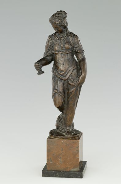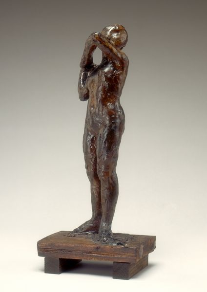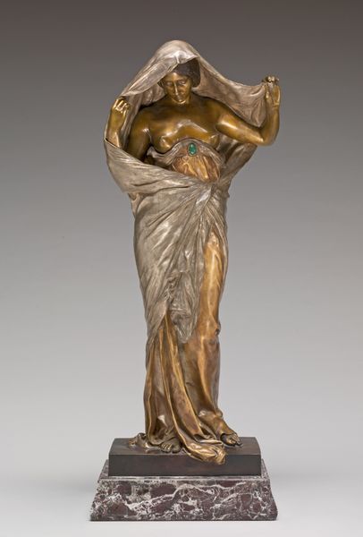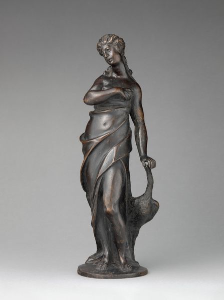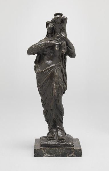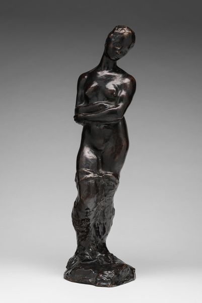 Curator: Standing before us is Gaston Lachaise's "Standing Nude," a bronze sculpture whose creation date remains, rather poetically, unknown. My first thought on seeing her? Bronze with all the warmth of terracotta... Editor: Warmth definitely. The pose, though, feels consciously classical. Almost Venus-like, emerging from the sea perhaps. She's substantial, yes, but that draping fabric and the hand coyly shielding her chest…it whispers of ancient iconography. Curator: Lachaise does have that touch of antiquity, doesn’t he? But it's also about celebrating the female form in its voluptuous entirety, which feels radically different, doesn't it? Forget idealisation. This feels like…real adoration of flesh. Editor: Adoration tinged with something more complicated, maybe. Nudity always carries a weight of societal expectations, you know. That slight gesture of concealment might also hint at a vulnerability beneath the bravado. Are we meant to gaze or look away? Curator: Oh, that’s the rub, isn’t it? She doesn’t meet our gaze. She is her own island. Perhaps this is her own personal narrative on classical form through self-assured modernity! She defines herself! Editor: It's compelling how a timeless medium like bronze continues to channel so many stories and psychological depths. Consider the shift in depictions of the female form across centuries, from goddess worship to objectification… Curator: Indeed. You put Lachaise’s Nude alongside, say, a Rubens painting and a photograph by Mapplethorpe, and suddenly we see her differently again. She is a celebration! Editor: Each artwork refracting back upon the other, altering our perspective. I'll certainly remember the visual language around classical female imagery from now on, particularly with how Lachaise seems to respond to it through this voluptuous sculpture. Curator: Absolutely, it's a beautiful paradox that I will now remember and feel forever connected to, thinking about its forms through different interpretations.