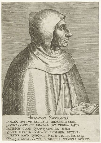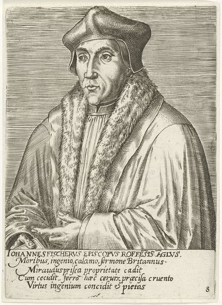 Curator: Philips Galle's engraving, "Portret van Rudolf Agricola," created in 1572, offers a fascinating glimpse into a Renaissance intellectual. It's currently housed in the Rijksmuseum. What are your initial thoughts? Editor: It strikes me as austere, almost stoic. The lines are incredibly precise, lending a gravity to the subject, a humanist of the Northern Renaissance, by the looks of it. The materiality is what grabs my attention. Curator: The print medium itself, the engraving technique, speaks volumes. Consider the sheer labor involved in producing those fine, controlled lines—a network of incisions into the copperplate, mirroring Agricola’s meticulous intellectual pursuits. We observe consistent hatching that denotes volume, depth, form. Editor: Exactly! And think about the engraver, Galle, and the economy that surrounds him; he would be working as a highly skilled craftsperson dependent on the patronage system of that time to make ends meet through reproducing portraiture, for example. The act of producing multiples changes art making at this time too; an ability to reach greater audiences to impart wisdom through printed word. Curator: Note how the formal elements support this air of Renaissance intellectualism. Agricola is framed frontally with little affect, his gaze turned slightly as if contemplating weighty matters, reflecting ideals of humanist thought. Galle’s craftsmanship, like Agricola's dedication to scholarly perfection, underscores this dedication to detail. The lettering that follows seems significant, the semiotics seem quite sophisticated here! Editor: Let's consider the role of printmaking at the time. The reproduction of Agricola's image democratized it, shifting cultural value beyond just aristocratic art buyers, which has resonance. The use of standardized printing processes is the genesis of modern methods of fabrication that changed what art is able to do. Curator: In essence, it's a piece steeped in controlled and focused intensity. Both Galle, the craftsman, and Agricola, the subject, are enshrined through this artifice and formalist approach. It leaves us appreciating Renaissance ideals! Editor: Right. From my angle, Galle’s skilled engraving captures not only a man but also the evolving material culture of knowledge and dissemination within Renaissance society through production. Both angles emphasize his importance and cultural standing during this transformational era.