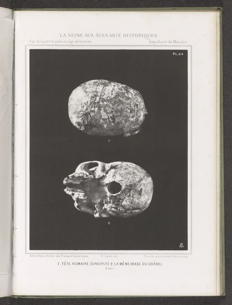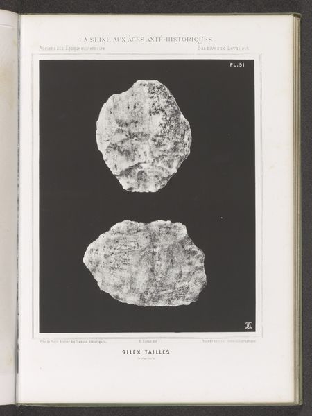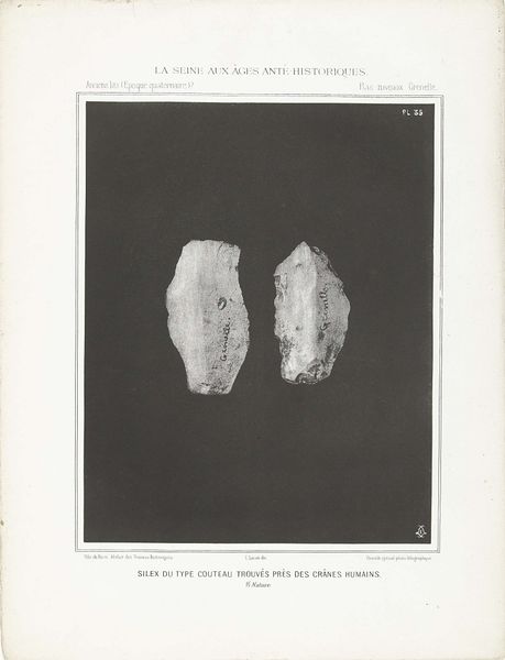 Curator: These lithographs from 1869, titled "Twee prehistorische vuurstenen, gevonden in het stroomgebied van de Seine"—"Two Prehistoric Flints, Found in the Seine River Basin"—offer an interesting, almost clinical depiction of ancient tools. I'm struck by the stark contrast. What are your initial thoughts? Editor: I find it fascinating that these ordinary rocks are presented with such formality. It elevates them somehow, turning rudimentary tools into objects worthy of artistic attention. How do you interpret this work in the context of its time? Curator: From a materialist perspective, this print forces us to consider the means of production, even when the 'artwork' itself predates what we conventionally understand as art. Consider the labor involved: the anonymous prehistoric hand that shaped the flint, the labor of the lithographer in recreating it, the paper-making, the printing press… All contribute to the aura this object acquires. Doesn't this presentation challenge the traditional boundaries between art and craft? Editor: It definitely does. It’s making me think about the societal structures involved in even finding and archiving something like this. What did it mean to document these objects in this way back in 1869? Curator: Precisely. The print becomes a vehicle for disseminating knowledge and shaping perceptions. How are these once-functional objects being transformed into commodities, artifacts of study and wonder, divorced from their original context of human survival and technological advancement? Editor: So, it's about observing the change in the flint itself— from a tool to an object to document? Curator: Yes, in that the value shifts from its function to its representation. The image encourages us to ponder not only prehistoric labor, but also the later labor of classifying, cataloging, and ultimately consuming the past through images like this. Editor: That's a perspective I hadn't fully considered. I was focused on the contrast of "ordinary rock" and "formal art," but this dives into all the implications of it being art. Curator: Indeed. It’s a reminder that even depictions of seemingly simple objects can reveal complex networks of labor, materiality, and social value.