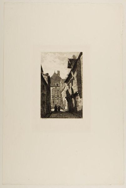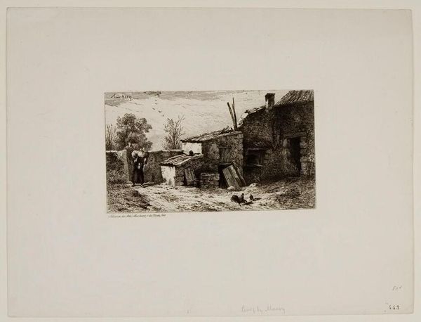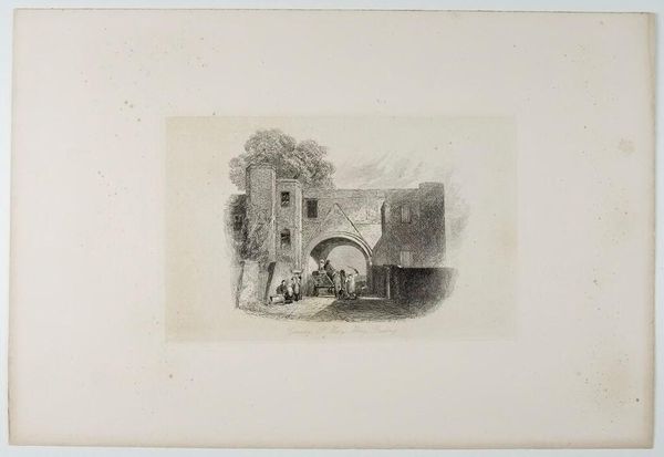 Curator: Let's pause here to appreciate Ferdinand Kobell's "Square Tower with a Gate." It's a masterfully rendered etching, brimming with the details of 18th-century life. Editor: It's so evocative; you can almost smell the dust and livestock. But I'm also struck by how this crumbling structure is still very much a site of commerce and passage. Curator: Precisely! Kobell captures that tension so well. This gate, likely part of an old city fortification, has been repurposed as a marketplace. It reflects the ongoing negotiation between progress and historical weight. Editor: I wonder, too, about who gets to pass through that gate, who gets to participate in this commerce. It's easy to romanticize, but these spaces are always sites of power. Curator: Absolutely. Though Kobell doesn't overtly depict social hierarchies, you can sense them in the composition. The gate acts as both a physical barrier and a symbolic threshold. Editor: It really makes you contemplate how we engage with the layers of history present in our own contemporary spaces. Curator: Indeed, a beautiful, poignant reminder that the past is never truly past.