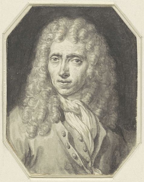 Curator: Oh, he looks like he’s about to share a deliciously wicked secret. What a sly smile! Editor: You're spot on about that captivating smirk. What we're looking at here is "Portrait of Nicolas Boileau Despréaux," dating back to 1710. It’s an engraving on paper by François Chereau the elder and it resides here at the Art Institute of Chicago. Curator: Ah, engraving – makes sense with that fine web of lines creating light and shadow. I can almost feel the texture of his wig, the plushness of his jacket! The precision is incredible, as is his expression. He looks so self-satisfied, yet approachable. Was this a popular way to circulate portraits? Editor: Precisely! Engravings like this made art accessible. Boileau, a prominent literary figure of his time, would have had his image circulated widely. Consider it a 18th-century social media, allowing him to cultivate a public image. Engravings played a crucial role in disseminating not only images of powerful figures, but ideas and aesthetics across society. The popularity of Baroque portraiture created a high demand for printed images, feeding into a growing market for art and printed material. Curator: So, like a profile picture, but make it Baroque? He certainly understands the assignment. I feel like this engraving elevates him, maybe idealizes him just a touch... and yet you see the real man in that expression. It's as though the artist managed to capture not just his likeness, but a whole attitude! Editor: Baroque art certainly has a knack for that theatricality. Note how the elaborate wig frames his face, drawing our eye directly to his expression. The inscription beneath the portrait even adds another layer – alluding to his place among literary giants like Horace. These visual cues underscore his importance and legitimize his status in the intellectual world. It is a reminder of how deeply image, status and influence were entwined in that era. Curator: He knows who he is, doesn't he? A portrait designed not just to remember him, but to make him legendary! I feel I understand the age a little better having seen this print. Editor: Indeed, engravings give us a glimpse into how reputations were made, remade, and circulated, reflecting the ever-changing tides of social and political landscapes. Thanks for noticing the small inscription on the artwork, by the way, as these are easy to miss, but often add layers to the piece in unexpected ways.