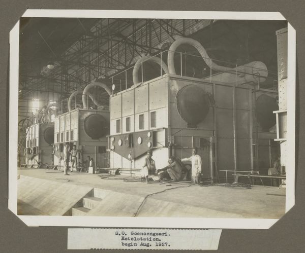 This photograph shows a boiler, located in S.O. Goenoengsari, and was taken in August 1927 by an anonymous photographer. The stark geometry of the metal structure, combined with the visible seams and rivets, speaks to the labor involved in its making. The photograph documents both the impressive scale of the boiler itself, and of the industrial infrastructure around it. The arrangement of the plates shows an aesthetic that values practicality and function over embellishment. The image serves as a reminder of the intricate dance between human effort, material qualities, and the relentless march of industrial progress. Ultimately, this image of a boiler invites us to consider the social and cultural implications of industrialization, prompting us to question the role of labor, consumption, and the shifting boundaries between art, craft, and industry.