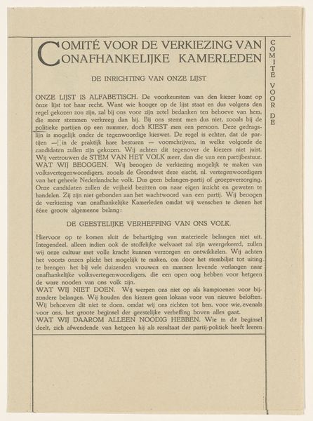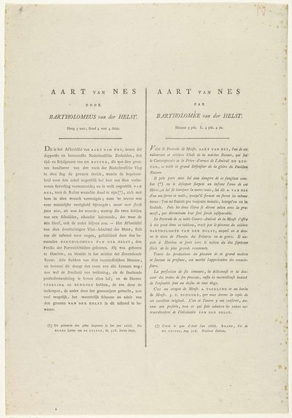 Editor: So, this print, "Tekst uit de inleiding over de bouw van Felix Meritis, p. 1-2," dates back to between 1789 and 1791. It’s by Cornelis Sebille Roos. The print shows two columns of text, one in Dutch and the other in French. What immediately strikes me is its formal layout, the typeface feels so of its time. How do you interpret this work within its historical context? Curator: This isn't just text; it's a proclamation, a statement of Enlightenment ideals taking physical form. The Felix Meritis society, as described here, was a product of its time – the late 18th century. Can you see how it embodies the era's drive for accessible knowledge and artistic expression? Editor: Yes, the very act of printing and distributing this text signifies that accessibility. But how does the societal context shape our understanding of the building itself? Curator: Well, the building was conceived as a center for arts and sciences during a period of immense social and political upheaval. It coincides with the French Revolution; revolution was in the air. Consider this society: who were its members? Who had access to this “Felix Meritis?" Was it truly open to everyone, or were there social barriers based on class, gender, or even race, that subtly shaped its purpose? Editor: That's a point I hadn't considered. It sounds progressive, but likely not for everyone... Curator: Exactly. Exploring the societal context—the inclusions and exclusions—helps reveal the full story. So, while celebrating the Enlightenment spirit, we also have to consider who was left outside those ideals. It also asks who is left outside now. Editor: It is something to think about when celebrating classic work, who are we forgetting in this appreciation? Curator: Precisely. This print serves as a reminder to interrogate even the most seemingly enlightened endeavors and think who gets a voice in Art History. Editor: This has made me see that this seemingly simple historical document really has much more to say.