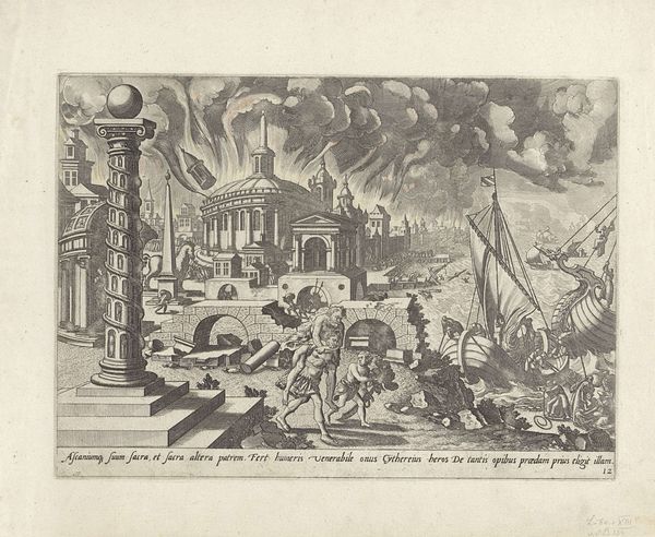 Editor: Here we have Jacques Callot's "Il Solimano, Act IV". The scene is chaotic, rendered with such precise lines that it almost feels like a stage set collapsing into violence. What do you see in this piece? Curator: The composition is striking. Callot uses the etching medium to create a dense network of lines, almost mirroring the disarray of the scene itself. Note the systematic rendering of depth – how architectural forms frame the foreground’s carnage. Editor: So the architectural elements serve a purpose beyond just setting the scene? Curator: Precisely. They are not merely backdrop, but structural devices. Consider how the flames both disrupt and highlight these forms. They embody the tension between order and chaos, a dialectic central to the artwork. Editor: I hadn't considered the flames as a structural element, that's fascinating! Curator: Indeed. Examining the piece through this lens enriches our understanding.