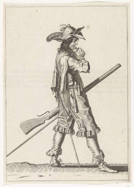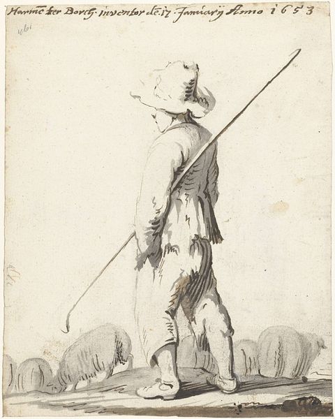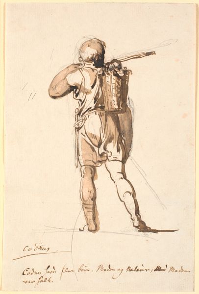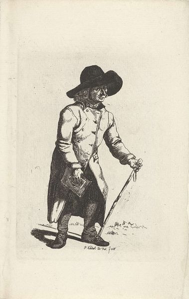 Curator: This is a pen and ink drawing by Nicolai Abildgaard, dating roughly from 1743 to 1809, entitled "Karikatur af en krumbøjet mand, gående mod venstre, med en stok i højre hånd"—or, in English, "Caricature of a hunched man walking to the left, with a stick in his right hand." It's currently held at the SMK, the National Gallery of Denmark. Editor: Well, immediately, there's a pronounced, almost mournful asymmetry in the figure. The slope of his back and the exaggerated, nearly grotesque, features—the nose, in particular—create a palpable sense of… decline? Curator: Precisely. The image taps into familiar archetypes: the aging dandy, perhaps, clinging to symbols of status—the wig, the impractical shoes—even as his body betrays him. The line work itself, varying in weight and density, sculpts the figure with a masterful economy. Notice how the faintest lines suggest the far leg, almost disappearing, heightening the impression of fragility. Editor: And yet, those shoes! Those ridiculous shoes with the elaborate bows. It feels almost subversive, a parody of elegance. Is it commenting on the superficiality of appearances? On the disconnect between social expectation and physical reality? Curator: Undoubtedly. The caricature as a genre thrives on that tension. Abildgaard masterfully employs exaggeration to expose vulnerability, poking at the inflated ego. The cane, ostensibly for support, reads more like a performative prop, highlighting the character’s artifice. One might argue it underscores societal structures, where image is carefully constructed even amidst decay. Editor: Yes, the cane’s gesture mirrors his drooping posture; the shadow mimics the man as if old age projects before him, as if in tandem, as a kind of announcement. He seems to have been caught unawares by his reflection in a mirror, realizing he is becoming everything he dreads: his own pathetic simulacrum. Curator: A compelling observation. I’m particularly struck by the detail in his face. The pursed lips, downturned eyes… There’s a distinct psychological weight to the portrayal. Abildgaard manages to convey not just physical decline, but perhaps also a sense of weariness, resignation, even regret. Editor: Well, Abildgaard certainly offers a potent image, a stark representation of temporal dissonance, wrapped within a veil of social commentary. Curator: Indeed. It speaks volumes about how art can dissect appearances and unveil uncomfortable truths.