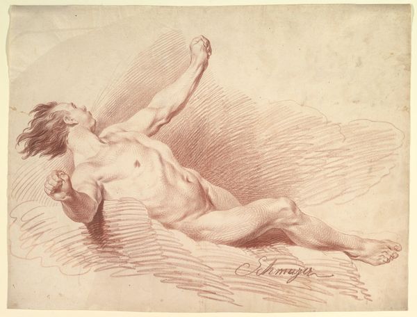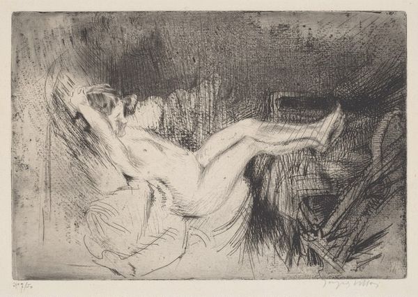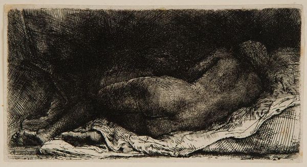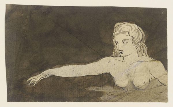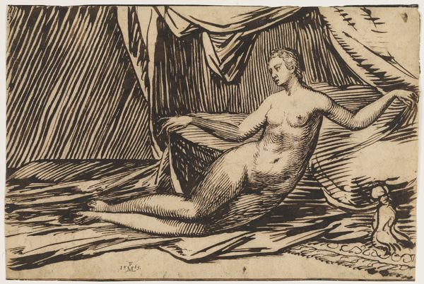 Curator: Melchior Lorck's "Reclining Woman", executed in ink in 1569, is a remarkable drawing housed here at the SMK. What are your first thoughts? Editor: The ink work is striking – so linear, almost architectural in its depiction of the landscape around her. There's a strange dichotomy of relaxation in the pose yet intensity in the sharp lines. Curator: Absolutely. The rigid lines framing the woman evoke a kind of confinement, while the reclining figure suggests leisure. Consider the period: this image appears at a time when notions of ideal femininity were highly policed. The woman is nude, yet posed in a way that is oddly demure, isn't it? Almost defiant. Editor: Exactly! And thinking about this drawing within a feminist framework, what does it mean for a male artist to capture the female nude in the late Renaissance? Lorck was a court painter, so this image might serve the pleasure of an elite audience. Curator: Good point. Lorck served in the courts of both the Ottoman Empire and various European rulers. His work frequently intersects politics and art. Editor: Perhaps the drawing engages in debates about European attitudes toward sexuality at the time. How did artistic representation contribute to controlling women's bodies and shaping perceptions? Curator: Certainly. Lorck was also creating detailed drawings and prints documenting cultural and political life during his time at the Ottoman court. I think we can see in this picture the beginnings of that ethnographic sensibility that will later come to full maturity. What seems a purely "artistic" work carries implicit social documentation. Editor: Looking at the sharp contrasts, I find a certain discomfort. Perhaps that's reflective of the contradictory expectations placed upon women in the 16th century – simultaneously idealized and scrutinized. Curator: Yes, a drawing can often hide many stories, prompt us to question, to see through layers of both artistic technique and the social environments within which an artist like Lorck was living and working. Editor: Absolutely, I agree that this piece highlights a significant intersection of art, power, and cultural identity during that period. It is both fascinating and, indeed, deeply unnerving.
