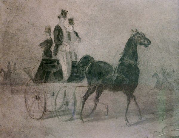 Curator: Here we have George Stubbs’ "Lord and Lady in a Phaeton," painted in 1787. The work, rendered in oil on canvas, currently resides at the National Gallery, London. Editor: It feels very composed and serene, almost theatrical. The carriage is stage-center, while the muted palette evokes a palpable sense of aristocratic calm, a pastoral elegance. Curator: Indeed, Stubbs, famed for his anatomical precision in equine paintings, here depicts more than just horses; he’s presenting a social portrait. Consider the Phaeton itself. It symbolizes wealth and status. The figures, positioned within it, are deliberately framed against the landscape. How do you interpret their positioning? Editor: They seem slightly detached, even from each other. He’s driving, active; she's beside him, a decorative accessory almost merging with the carriage’s colour palette. The symbols feel very pronounced – her ornamental hat especially reads to me as a signifier of wealth. It reminds me how portraits were about power as much as likeness. Curator: Precisely. Stubbs was certainly a chronicler of his time. The burgeoning wealth of the landed gentry, their relationship to the landscape, and their careful presentation of themselves all coalesce here. Observe the landscape. It's idealized, controlled. Editor: It brings to mind the Enclosure Acts and the reorganization of land. Everything is curated. Curator: Absolutely. And how the paired horses act as a symbol of power under control. There is a clear statement about humanity’s dominance over nature, and this aristocratic couple, dominating the pulling horses. This resonates within the broader political narratives of the era. Editor: A polished mirror reflecting the ambitions and anxieties of a specific social strata at a pivotal moment. Curator: I agree. It’s an intricate tapestry woven from social ambition, status, and the subtle power dynamics of the time. Editor: It seems that every aspect of this composition underscores how closely intertwined class and visibility were, which continue to be relevant cultural through-lines.