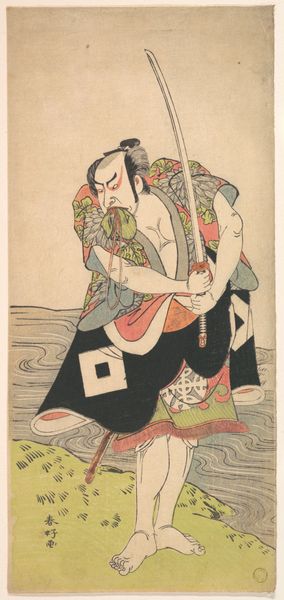Curator: Look at this remarkable woodblock print by Katsukawa Shun'ei, created sometime between 1778 and 1798. It's entitled "The Fourth Iwai Hanshiro as a Woman Holding a Crystal Ball and Dancing on the Bank of a Stream.” Editor: There's something melancholic about it. The muted colors, her contemplative gaze…and that crystal ball seems to weigh heavily in her hands. It's like she's burdened by its revelations. Curator: The image captures Iwai Hanshiro, a prominent kabuki actor, in a female role, which was common in ukiyo-e prints of the time. These prints were highly influenced by, and reflective of, Edo period popular culture and served as advertisements for Kabuki theatre productions and the actors within them. Editor: Knowing that contextualizes it. The figure is captivating. You can practically feel the texture of the robes, with the juxtaposition of intricate designs on contrasting layers, all flowing around her body. It speaks volumes about performativity, and gender expression, how an actor can transform through costume and gesture. Curator: Absolutely. Shun'ei was a master of capturing the likeness and essence of kabuki actors. The artist employed precise lines to outline the figure while expertly varying their thickness, length, and direction to bring a feeling of movement to a figure otherwise presented to us in quiet reflection. Notice the economy of line in rendering the landscape compared to the detailing lavished on the costume! Editor: And how the landscape—just that delicate branch, that small stream—further isolates the subject, drawing our focus to her internal world. We're compelled to ask who this is and what we're seeing, to analyze the narrative we assume. Curator: Indeed, the use of such imagery had socio-political implications, because while depicting an actor who specialized in female roles could celebrate performance and creativity, it also offered space to negotiate evolving social attitudes around gender, especially if this imagery was used to spread rumor or promote some socio-political cause. It's a window into the past that also invites critical engagement with the present. Editor: Definitely something to reflect on while enjoying the elegance and emotional weight of this exquisite print. Curator: It gives us much to contemplate in terms of how kabuki has been socially negotiated and recorded through art forms, yes?