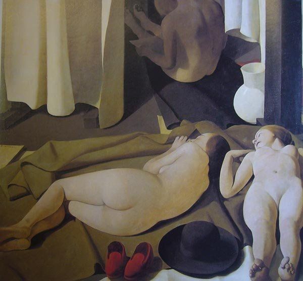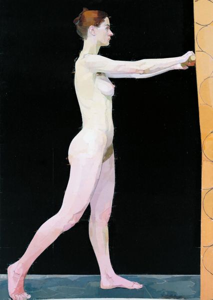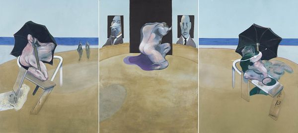 Curator: Figures in Movement, painted by Francis Bacon in 1973. What do you make of it? Editor: Pure anxiety, wouldn't you say? Those figures seem to be disintegrating even as they're trying to...what, flee? What is going on there? Curator: Let's consider the materials. Bacon’s distinctive application of oil paint—the texture, the way he builds up layers, scrapes them back, distorts the human form—it's all a part of expressing modern alienation through the very act of making. The canvas is not merely a surface but a battleground. Editor: A battleground, yes, absolutely! And look at that shoe casually placed behind the figure on the left, seemingly untouched by the turmoil of the rest of the scene! It makes me feel as if a play is starting where there is only enough budget for most of the elements of a scene. Curator: He often incorporated found images – newspaper clippings or photographs— into his works, literally embedding pieces of reality and sometimes a map, as we can see at the bottom, within the constructed space of the painting. He challenges the autonomy of the art object. The labor and source material behind its fabrication become part of the reading. Editor: Absolutely, but the figures also suggest classical statuary, even Greek ideals... yet, filtered through Bacon's tormented vision. What is he doing trying to paint figures, when the reality of being is so far away from any ideals. It also reminds me how it is difficult to create anything out of something broken, you will always be battling the pre-existing properties of something broken. Curator: We must remember Bacon's influences - Muybridge's photography and its treatment of motion. By acknowledging such predecessors, Bacon’s paintings underscore art-making as a cumulative and inherently collaborative process that extends far beyond the studio, connecting creative and intellectual fields, while at the same time being deeply introspective and almost isolated. Editor: Introspective for sure. A map of Bacon's internal geography, perhaps. Thinking out loud is rarely pretty or neat...and that's the case here as well! Curator: A suitable final thought indeed; thank you for sharing that with me, let us move on.