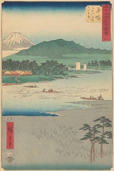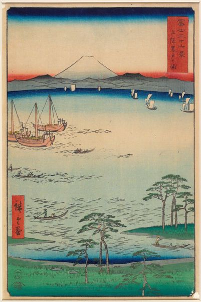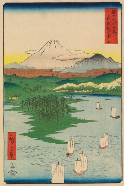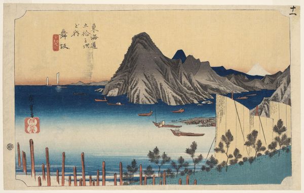 Curator: Utagawa Hiroshige’s woodblock print, "Folio From the Upright Gojusan Tsuji Tokaido," created in 1858, presents a stunning coastal vista. The print work's composition really grabs the eye. Editor: It certainly does. The placid blues and grays give the scene a tranquil quality, yet there's something subtly melancholy about it, wouldn't you agree? Maybe it is just the looming volcano on the horizon. Curator: That "something" might be the deliberate use of line and color; notice how the linear perspective leads your gaze to that dominating mountain, grounding the aesthetic importance of the image with its solemn immovability, which in turn is countered by these vessels traversing a scene defined by subtle wave crests. These ships bring balance to a powerful work. Editor: Absolutely. But there is tension that remains for the contemporary observer. The ukiyo-e tradition, while seemingly depicting 'the floating world,' frequently served as propaganda reflecting socio-political conditions. Consider that maritime traffic represented a critical means of resource distribution at that time; yet what access did people of lower economic and social status really have? Where are their boats? Is this landscape truly for everyone or only an imagined space, a 'floating world,' reserved only for the privileged? Curator: Interesting point. Yet if we fixate only on your critique, aren't we then losing the intentional artistry— the complex visual techniques, color composition, the overall grace of the piece, especially Hiroshige's signature atmospheric effects? He elevates, here, a very particular understanding of space. It is that mastery which moves me to explore further the nature of form and function. Editor: Agreed! The work, itself, contains contradictions that can be parsed across a spectrum of inquiry. The scene itself feels immediate; simultaneously, the boats are still used, so we might ask who are the people making these decisions for commerce, travel, and personal interest? What kinds of socio-economic disparities exist in that local system that can inform present day inequality. Curator: It’s intriguing to consider all these layers of interpretation sparked by the deceptively simple lines of Hiroshige's creation. Editor: Indeed, it encourages a necessary interrogation of landscape, power and privilege, both then and now.