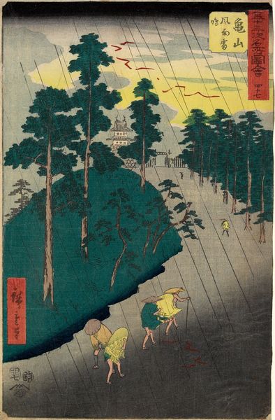 Curator: This is Utagawa Hiroshige's woodblock print, "No. 47, Kameyama: Wind, Rain and Thunder," from his series, "Famous Sights of the Fifty-three Stations," also known as the Vertical Tokaido. Editor: It's immediately striking—the diagonal rain lines create a sense of drama and movement, almost pulling you into the scene. Curator: Hiroshige's series captured the Tōkaidō Road, a vital route connecting Edo (modern Tokyo) and Kyoto. These prints were not just landscapes, but windows into Japanese society and travel culture. Editor: The composition is fascinating. The way the artist uses color to create depth and contrast with the yellow sky, while the figures on the road look so small. Curator: It's a comment on the scale of nature versus humanity's place within it. These prints were accessible art, allowing everyday people to experience the beauty of their country. Editor: The graphic quality, the simplification of forms... it's a powerful statement about the transience and enduring beauty of this landscape.