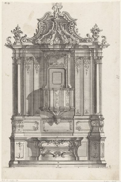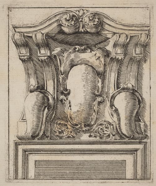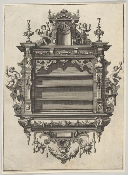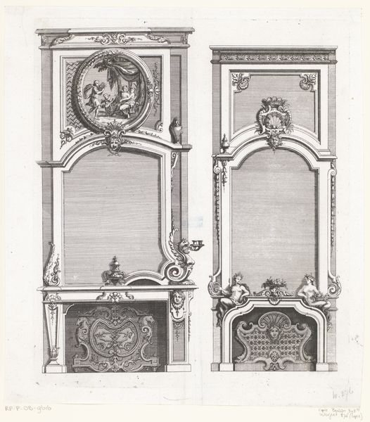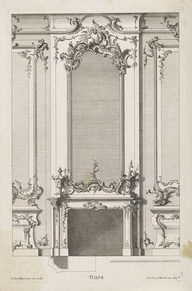 Emanuel Eichel created this print of a mantelpiece with putti in an unknown year. The composition is dominated by a symmetrical arrangement, where the vertical lines of the wall panels intersect with the elaborate curves of the mantelpiece and mirror frame. This contrast between straight and curvilinear elements creates a dynamic visual tension. The artist employs hatching and cross-hatching to simulate depth and texture, drawing our eye to the ornate details of the floral arrangements and the playful figures of the putti. These elements, rendered with precision, evoke a sense of classical elegance and perhaps a gentle nod to the decorative excess of the Rococo period. Eichel has destabilized the simplicity of architectural design by layering ornate, organic forms over rigid, geometric structures. This interweaving of natural and artificial motifs challenges fixed notions of order and beauty, suggesting a world where nature and artifice are harmoniously intertwined. This interplay invites us to reconsider our perceptions of space and decoration.