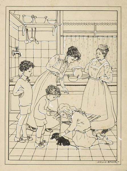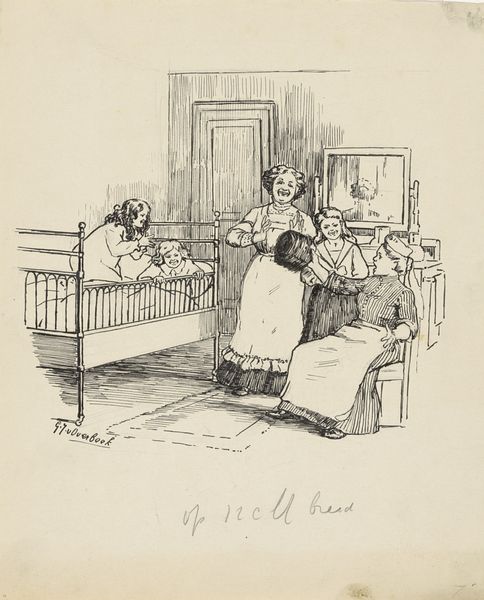 Nelly Spoor created this line drawing, "Children in a Hospital Ward," capturing a scene of children resting in a hospital. Here, the pervasive image of children confined to beds evokes the universal vulnerability tied to illness and dependence. The nurse becomes an important figure in the composition; a historical echo of caregivers through the ages. Consider the evolution of this figure: from ancient healing deities to the modern medical professional. This role carries a weight of care and responsibility. The canopy over the child's bed appears throughout history, as a symbol of protection and nurturing. The repetition of motifs such as the bed, the caregiver, and the enclosed space invite reflection on the collective anxieties surrounding health and care, engaging us on a primal, almost subconscious level.