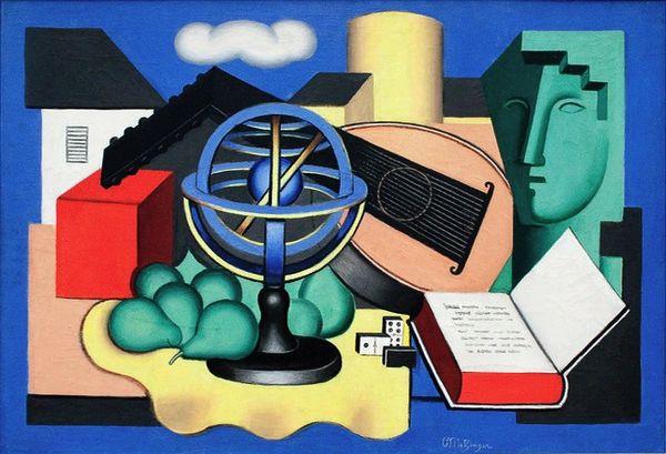 Curator: Gazing at Jean Metzinger's "La Roulette" from 1924, one immediately feels this odd stillness, a silent choreography of shapes. Editor: It's so playful, yet contained! The juxtaposition of that vivid color palette with these rigid, almost architectural forms…there's a delightful tension there. Curator: Indeed! Metzinger, ever the thoughtful Cubist, meticulously dissects and reassembles our perceptions of reality. Look at the way the composition integrates elements like a roulette wheel, a goldfish bowl, a banjo… Editor: …and the peculiar teapot! They’re like players in a visual game, all rendered in sharp, angular forms. It feels less about depicting the objects themselves, and more about capturing a fleeting sense of the Jazz Age, the buzz of excitement. Curator: Precisely. Metzinger aims to reveal the underlying structure of these objects and the sensations they evoke. Notice how he flattens space and fractures forms? This pushes us to see each element from multiple viewpoints simultaneously. Editor: You know, the more I look at it, the more I see it as a meditation on chance and artifice. That little goldfish swimming in its geometric prison, the spinning roulette... everything feels deliberate and controlled, yet suggestive of randomness. It's like Metzinger's showing us how life can feel at once both fated and utterly unpredictable. Curator: Yes, a compelling tension between order and chance—echoing the zeitgeist of the roaring twenties. What else catches your eye? Editor: It's got me thinking about what all of the elements truly symbolize for the artist: the guitar speaks of nights filled with rhythm and dancing, and of people casting aside their former restrained expectations. Curator: A truly vibrant reflection of a complex period viewed through a distinctive Cubist lens. Thank you for unpacking the composition. Editor: An intricate composition that encourages you to ponder the game of life and our pre-determined pathways; a wheel that decides one’s outcome while casting off constraints. Thank you.