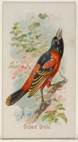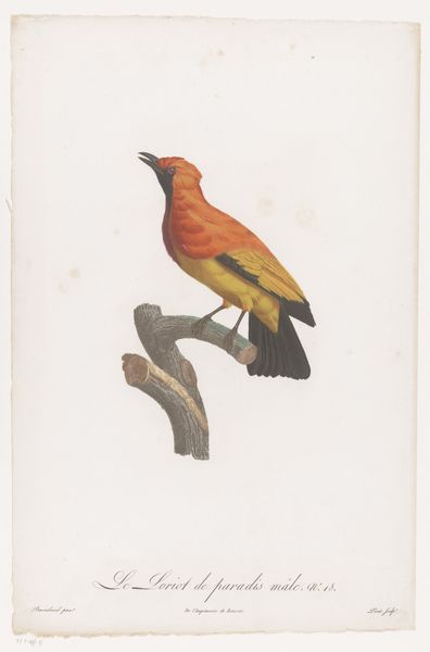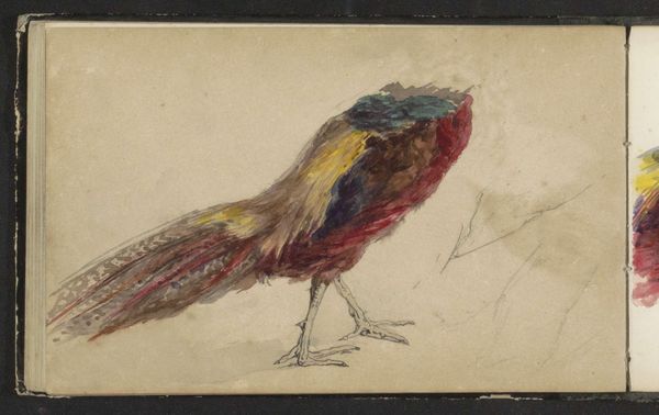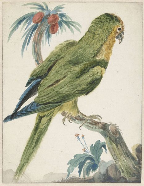 Johann Teyler created this watercolor and etching of a parrot, sometime in the late 17th century. The composition is dominated by the verticality of the perch and the bird itself. Notice how Teyler captures the bird's texture, layering delicate brushstrokes to mimic feathers. The parrot's body is a study in contrasting colors: greys and blues against vibrant reds and yellows. These hues, while lifelike, also serve a structural purpose, dividing the bird into distinct zones. The tail feathers, rendered in fine lines, create a sense of depth and movement. The parrot, perched rigidly on a pole, raises questions about control, captivity, and the exotic. Teyler's precise, almost scientific, rendering invites us to consider the cultural and philosophical implications. The bird, as a sign, becomes a site of ongoing interpretation, reflecting shifting attitudes toward nature, knowledge, and representation.