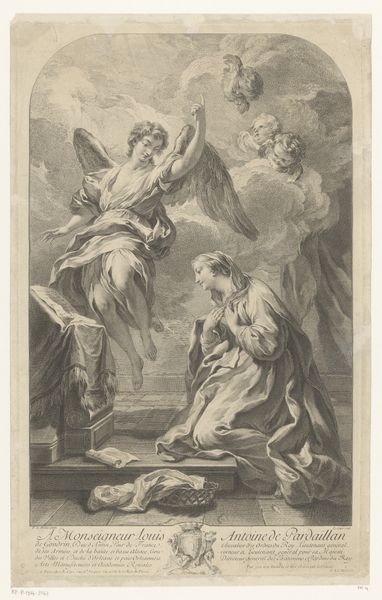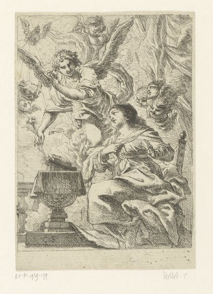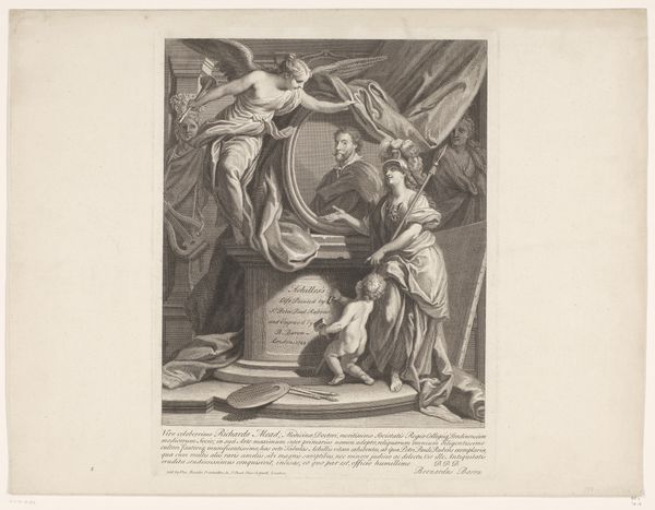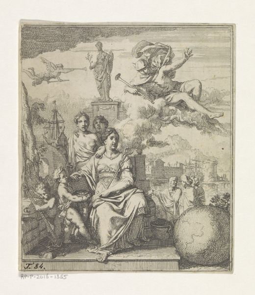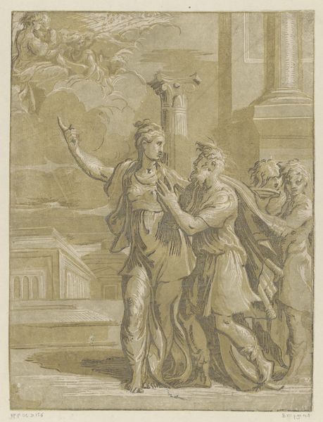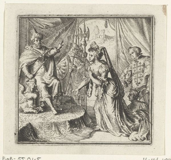 Curator: Before us, we have Jeremias Falck’s engraving, "Koningin Semiramis verneemt nieuws over de Babylonische opstand," created sometime between 1646 and 1658. Editor: My immediate response is to its stark contrast – it has an intensity despite its delicate linework. There is an energy I did not expect in a historical scene rendered with this particular technique. Curator: Precisely. Note how the dramatic composition directs our eye—from the agitated messenger, foreground right, to Queen Semiramis recoiling in the center-left. Observe also the architecture that imprisons her court. It really captures the disruption of order, the instant news upends everything. Editor: I am struck by how the artist creates these stark differences in texture. We move from the rough-hewn garments of the messenger to the ornate details of Semiramis' gown. How were such contrasts created in the printing process? How long did it take to achieve that fineness of detail, especially in depicting those billowing sleeves and luxurious fabrics? It looks very labour intensive. Curator: The line engraving method requires considerable skill to create varying depths through the pressure exerted on the burin. Consider too, how that precision translates the political weight of her crown and heavy jeweled bodice! Note also how the background with cityscapes accentuates that sense of place that contrasts Semiramis herself who appears somewhat static. Editor: It makes one consider how this medium circulated. Who would have bought this print? Where might it have hung, and what other printed materials were being produced? These images provide a tangible connection to how knowledge and narratives were being disseminated. What other prints or media shaped perceptions of power at that time? Curator: The print also captures the psychological weight on Semiramis: the concern is palpable and almost pushes back on the power structures you highlighted. You are spot on – Falck's print speaks to this rich, layered moment. Editor: Absolutely, it’s compelling to see this intricate rendering which brings that fraught historical narrative vividly to life. And in focusing on production it makes one conscious of how historical events like this are communicated and spread.