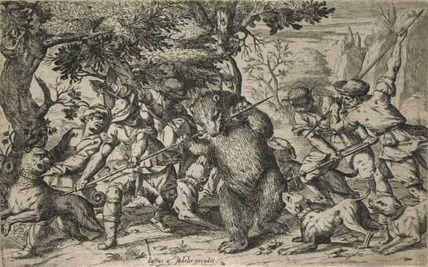 Curator: J. Zaal's "Wild Boar Hunt" presents a frenzied tableau. The immediate impact is one of intense energy and chaotic entanglement. Editor: Note how the artist has structured the composition—a visual pyramid of bodies, culminating in the boar's defiant head. The linearity of the dogs emphasizes the underlying tension. Curator: The boar, often a symbol of courage and ferocity, finds itself besieged. Hunting scenes carry layers of meaning, power, control over the natural world. Editor: And observe the detailed rendering of each animal, from the hounds' straining muscles to the boar's bristling fur—the material reality is almost palpable, no? Curator: It suggests that the artist was interested in conveying the intensity of the chase, the brutal reality of man versus nature. Editor: Indeed. It's a visceral exploration of dominance, framed through a starkly realized visual structure. Curator: A reminder of the symbolic weight carried by such scenes throughout art history. Editor: A very telling piece that invites contemplation of its composition and themes.