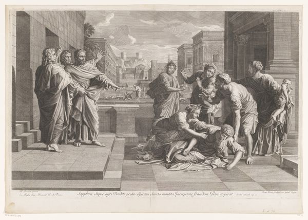 Curator: Here we have Jean Pesne’s "Esther voor Ahasveros," an engraving dating somewhere between 1643 and 1700. It's currently held in the Rijksmuseum collection. The dramatic scene unfolds with stark contrasts, doesn't it? Editor: Yes, that immediate tonal quality and the emphasis on line really struck me. I’m curious about the labor involved in such a detailed engraving, how many states it went through before the final print? You can see the artist truly grappling with how to use the material. Curator: Absolutely. Look how the engraving captures the power dynamic between Esther and Ahasuerus. Esther collapses before him, doesn’t she, her vulnerability on display in her fainting pose, while he sits enthroned, unmoved. It highlights the gendered expectations and risks she undertakes in approaching the king. Editor: The composition emphasizes the space and setting as well. The architectural details feel less like mere background and more like integral parts of the power structure that both frames and oppresses her. Those large imposing columns loom over everyone. I’m also thinking about the engraver's relationship to these systems, the patronage they worked under. Curator: Exactly. The figures attending to Esther also strike me—they represent female solidarity in the face of patriarchal dominance. They literally prop her up in a world that constantly tries to diminish her power. It really captures a specific moment in this famous biblical story when Esther, who risked everything to approach the king without being summoned, exposes the plot of Haman and ultimately saves the Jews of Persia from annihilation. Editor: And that story certainly resonated across different social strata. What kind of papers and inks were available during that period? That undoubtedly would have impacted how accessible the print was, and who got to see it, affecting its impact. Curator: Thinking about it through these intersectional lenses reveals layers of meaning in the work—about female agency, power, resistance. Editor: Right. These prints served as accessible narratives. Studying their production allows a view into their time and social class. Curator: Well, looking closely together like this, this is precisely why these prints remain so compelling after centuries! Editor: Indeed! Understanding both the artistic means and historical forces brings it alive in unique ways.