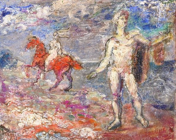 Odilon Redon painted ‘Centaurs’ with oils, at an unknown date. Isn't it fascinating how he creates such a dreamlike atmosphere, just by layering and blurring the colors? Look closely, and you'll notice how the brushstrokes almost dissolve into one another, the browns and blues are so thick, they seem to breath. There's a real tension between the clarity of form, we can clearly see centaurs, and the almost abstract way the paint is applied. Do you see how he uses these little dabs of contrasting colors, like pinks and yellows, to make the whole thing vibrate? It's as if he's not just painting what he sees, but also what he feels. Redon reminds me of late Turner, especially in his use of color to evoke mood and emotion. Both artists invite us to wander into a world of imagination, where nothing is quite as it seems.
